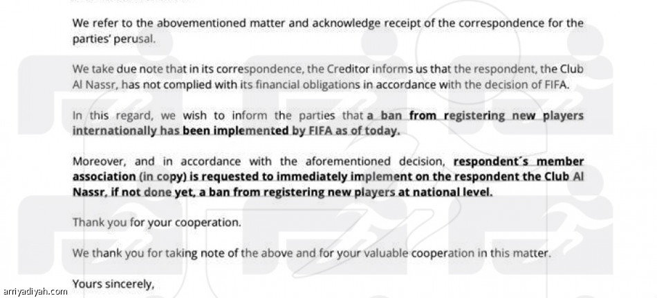 وكشفت صحيفة الرياضية السعودية، أن الاتحاد الدولي لكرة القدم، فيفا، أرسل خطابا رسميا إلى نادي النصر في الساعات القليلة الماضية، يبلغه بمنعه من قيد أي أي لاعب محلي لعدم تنفيذه قرار غرفة فض المنازعات الدولية بشأن مستحقات نادي ليستر سيتي الإنجليزي في صفقة أحمد موسى.