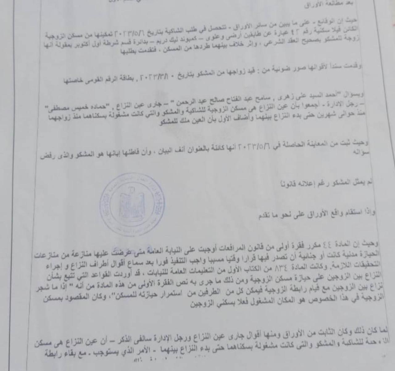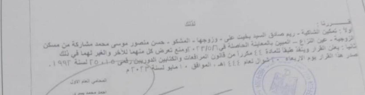 وأضاف نص القرار: لما كان ذلك وكان الثابت من الأوراق ومنها أقوال جاري عين النزاع ورجل الإدارة سالفي الذكر - أن عين النزاع هي مسكن الزوجية للشاكية والمشكو والتي كانت مشغولة بسكناهما حتى بدأ النزاع بينهما، لذلك قررنا أولا تمكين الشاكية - ريم صادق السيد على وزوجها المشكو - حسن منصور موسى محمد مشاركة من مسكن عين النزاع - المبين بالمعاينة الحاصلة في 2023/5/6 ومنع تعرض كل منهما للآخر والغير لهما في ذلك القرار وينفذ طبقًا للمادة 44 مكررًا من قانون المرافعات والكتابين الدوريين رقمي 25 لسنة 1929.