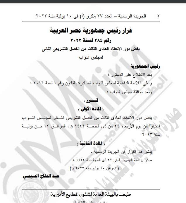 نشرت الجريدة الرسمية في عددها رقم 27 مكرر (أ) بتاريخ 10 يوليو سنة 2023، قرار رئيس الجمهورية بفض دور الانعقاد العادي الثالث من الفصل التشريعي الثاني لمجلس النواب.