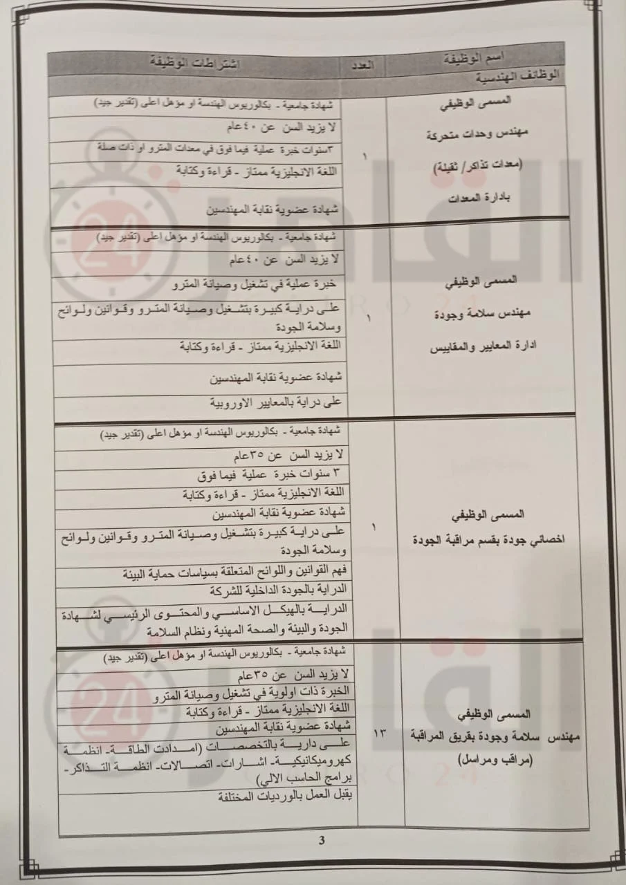 وأوضحت الشركة أنه يتم قبول طلبات المتقدمين لجميع الوظائف المطلوبة بمشروع القطار الكهربائي الخفيف LRT، في إطار نظام التعاقد السنوي، على أن يكون التجديد حسب الكفاءة والاحتياج من قبل مسئولي الشركة المصرية لإدارة وتشغيل المترو.