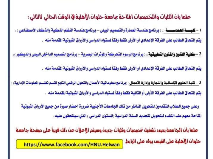 - يتم قبول الطلاب على الكليات المناظرة فقط بجامعة حلوان الأهلية والتخصصات المناظرة فقط بكل كلية.