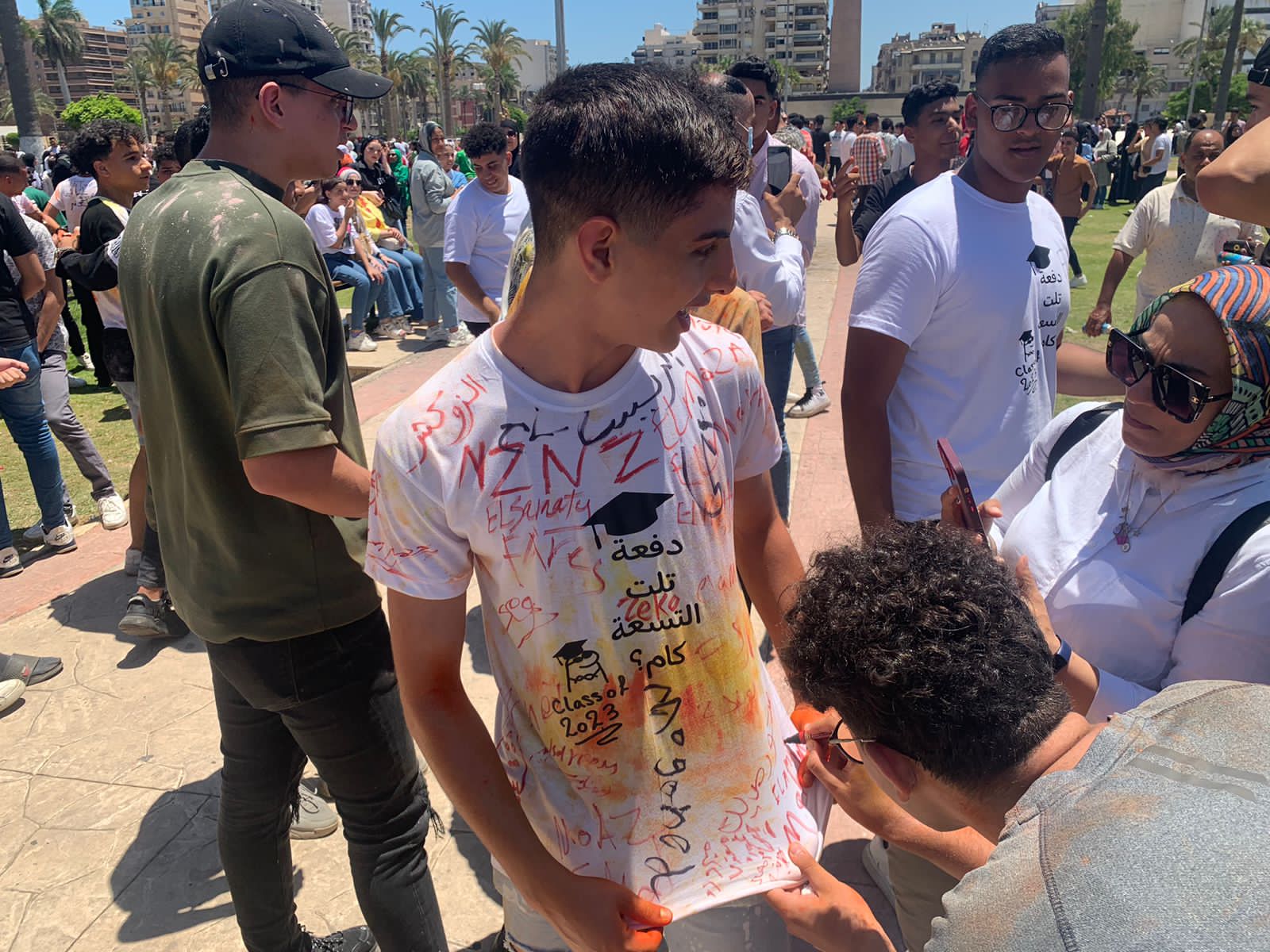 وارتدى الطالب تشيرت مكتوبا عليه: تلت التسعة كام، فيما حرص زملاؤه من الطلاب على التوقيع بأسمائهم على التيشرت.