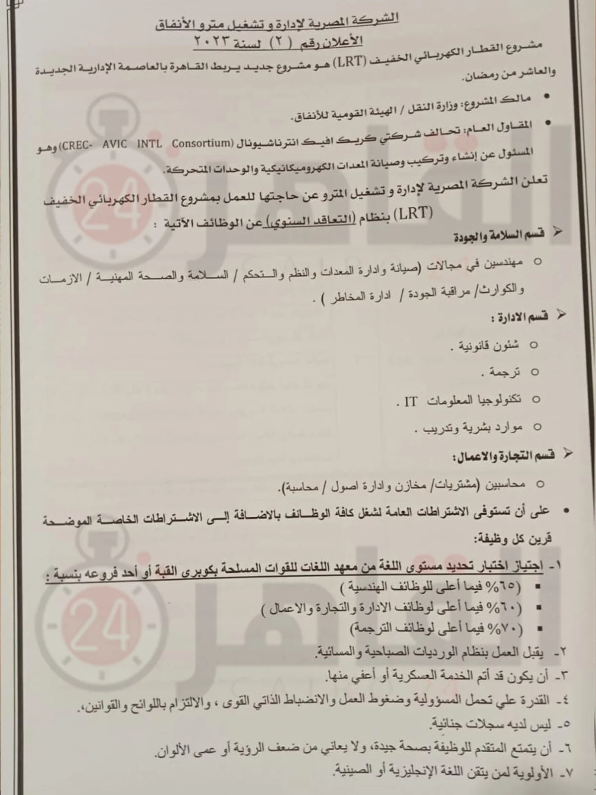 وكانت الهيئة القومية لمترو الأنفاق، أعلنت في 18 من يونيو الماضي فتح باب التقدم لبعض الوظائف الشاغرة بمشروع القطار الكهربائي الخفيف LRT، حيث يتم قبول طلبات المتقدمين لجميع الوظائف المطلوبة بمشروع القطار الكهربائي الخفيف LRT، في إطار نظام التعاقد السنوي على أن يكون التجديد حسب الكفاءة والاحتياج من قبل مسئولي الشركة المصرية لإدارة وتشغيل المترو.