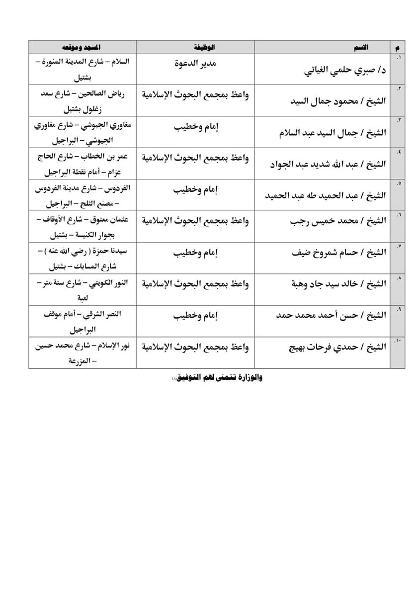 وقالت الأوقاف في بيان لها: في إطار التعاون المشترك والتنسيق المستمر بين وزارة الأوقاف والأزهر الشريف، وبرعاية كريمة من الإمام الأكبر الأستاذ الدكتور أحمد الطيب شيخ الأزهر، ووزير الأوقاف الأستاذ الدكتور محمد مختار جمعة، تنطلق قافلة دعوية مشتركة بين الأزهر الشريف ووزارة الأوقاف إلى محافظة الجيزة بشتيل، اليوم الجمعة: 26 ذو الحجة 1444هـ، الموافق 14/7/2023م، وتضم 10 علماء: خمسة من علماء الأزهر الشريف، وخمسة من علماء وزارة الأوقاف، ليتحدثوا جميعًا بصوت واحد حول موضوع: فضائل الاستغفار، وذلك على النحو التالي: