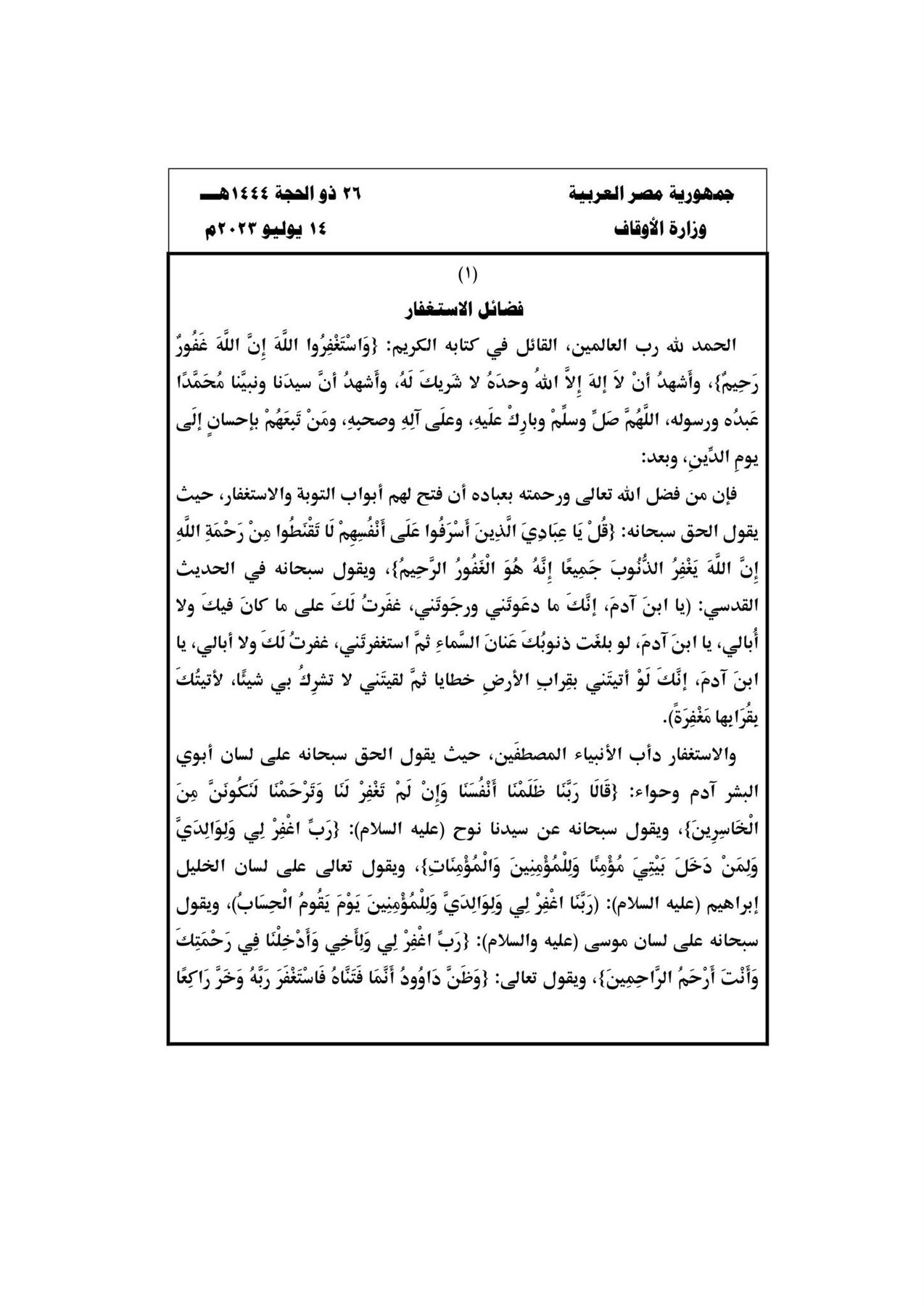 وتبدأ خطبة الجمعة اليوم كالتالي: اللهَ غَفُورٌ الحمد لله رب العالمين القائل في كتابه الكريم: {وَاسْتَغْفِرُوا اللَّهَ ان رَحِيمٌ)، وأشهد أن لا إله إلا الله وحدَهُ لا شَريكَ لَهُ، وأشهد أن سيدنا ونبينا مُحَمَّدًا عبده ورسوله، اللَّهُمَّ صَلِّ وسلم وبارك عليهِ، وعلَى آلِهِ وصحيهِ، وَمَنْ تَبِعَهُمْ بإحسان إلى يوم الدين، وبعد: فضائل الاستغفار فإن من فضل الله تعالى ورحمته بعباده أن فتح لهم أبواب التوبة والاستغفار، حيث يقول الحق سبحانه: {قُلْ يَا عِبَادِيَ الَّذِينَ أَسْرَفُوا عَلَى أَنْفُسِهِمْ لَا تَقْنَطُوا مِنْ رَحْمَةِ اللَّهِ إِنَّ اللَّهَ يَغْفِرُ الذُّنُوبَ جَمِيعًا إِنَّهُ هُوَ الْغَفُورُ الرَّحِيمُ، ويقول سبحانه في الحديث القدسي: يا ابن آدم إنك ما دعوتني ورجوتني غفرت لك على ما كان فيك ولا أبالي، يا ابن آدم لو بلغت ذنوبُكَ عَنانَ السَّماءِ ثمَّ استغفرتني غفرت لك ولا أبالي، يا ابن آدم إِنَّكَ لَوْ أتيتَني بقراب الأرض خطايا ثم لقيتني لا تشرك بي شيئًا، لأتيتُك | يقُرَابِها مَغْفِرَةٌ).