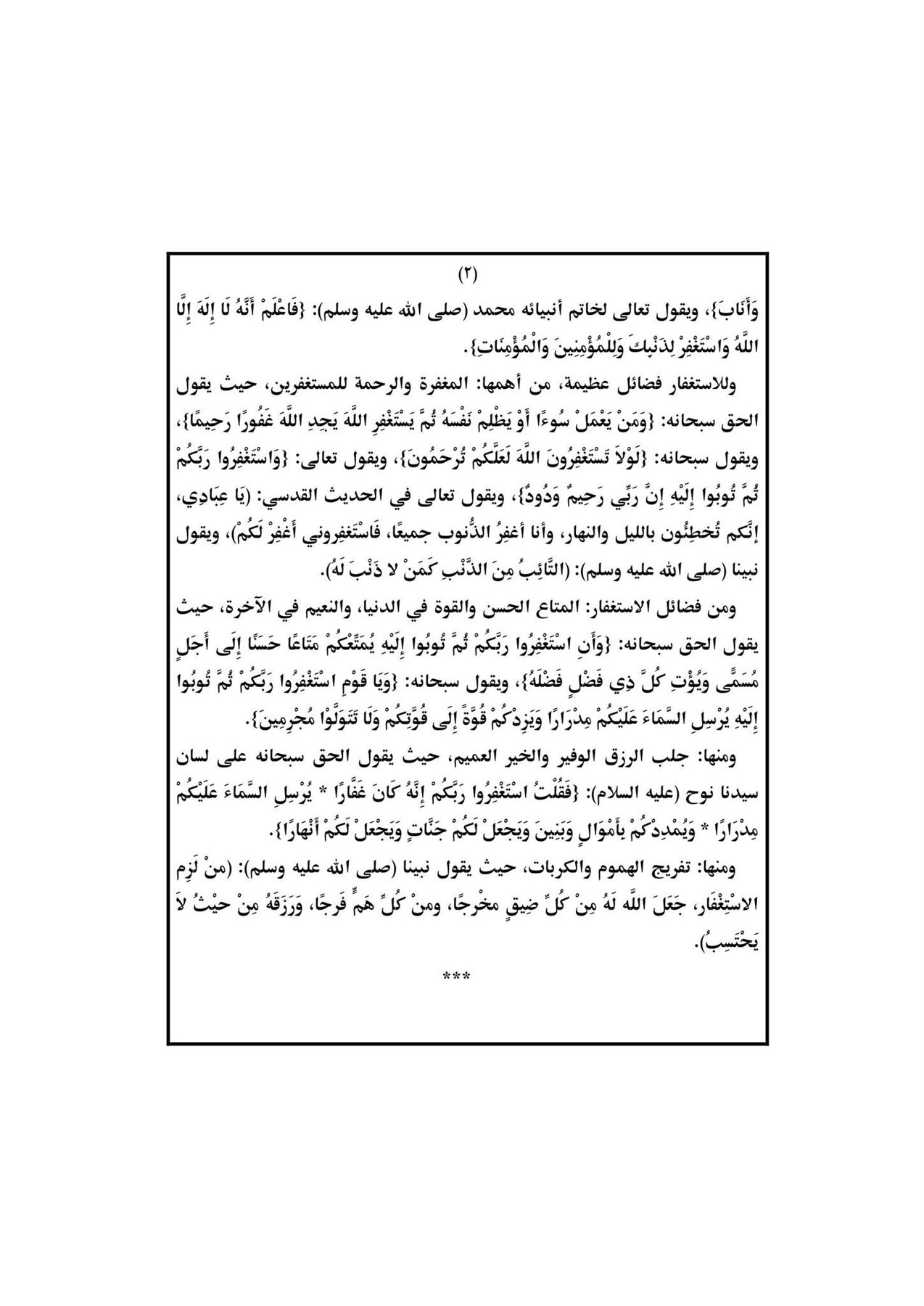 وأكملن: وللاستغفار فضائل عظيمة من أهمها: المغفرة والرحمة للمستغفرين حيث يقول الحق سبحانه: {وَمَنْ يَعْمَلْ سُوءًا أَوْ يَظْلِمْ نَفْسَهُ ثُمَّ يَسْتَغْفِرِ اللَّهَ يَحِدِ اللَّهَ غَفُورًا رَحِيمًا)، ويقول سبحانه: {لَوْلَا تَسْتَغْفِرُونَ اللَّهَ لَعَلَّكُمْ تُرْحَمُونَ)، ويقول تعالى: {وَاسْتَغْفِرُوا رَبَّكُمْ | ثُمَّ تُوبُوا إِلَيْهِ إِنَّ رَبِّي رَحِيمٌ وَدُودُ، ويقول تعالى في الحديث القدسي: (يَا عِبَادِي إنَّكم تُخطِئُون بالليل والنهار، وأنا أغفِرُ الذُّنوب جميعًا، فَاسْتَغْفِرُونِي أَغْفِرْ لَكُمْ)، ويقول نبينا صلى الله عليه وسلم): (التَّائِبُ مِنَ الذَّنْبِ كَمَنْ لا ذَنْبَ لَهُ. ومن فضائل الاستغفار المتاع الحسن والقوة في الدنيا والنعيم في الآخرة، حيث يقول الحق سبحانه: {وَأَنِ اسْتَغْفِرُوا رَبَّكُمْ ثُمَّ تُوبُوا إِلَيْهِ يُمَتَّعُكُمْ مَتَاعًا حَسَنًا إِلَى أَجَلٍ مُسَمًّى وَيُؤْتِ كُلَّ ذِي فَضْلٍ فَضْلَهُ، ويقول سبحانه: {وَيَا قَوْمِ اسْتَغْفِرُوا رَبَّكُمْ ثُمَّ تُوبُوا | إِلَيْهِ يُرْسِلِ السَّمَاءَ عَلَيْكُمْ مِدْرَارًا وَيَزِدْكُمْ قُوَّةً إِلَى قُوَّتِكُمْ وَلَا تَتَوَلَّوْا مُجْرِمِينَ}. ومنها جلب الرزق الوفير والخير العميم، حيث يقول الحق سبحانه على لسان سيدنا نوح (عليه السلام): {فَقُلْتُ اسْتَغْفِرُوا رَبَّكُمْ إِنَّهُ كَانَ غَفَّارًا * يُرْسِلِ السَّمَاءَ عَلَيْكُمْ | مِدْرَارًا * وَيُمْدِدْكُمْ بِأَمْوَالٍ وَبَنِينَ وَيَجْعَلْ لَكُمْ جَنَّاتٍ وَيَجْعَلْ لَكُمْ أَنْهَارًا. ومنها تفريج الهموم والكربات حيث يقول نبينا صلى الله عليه وسلم): (من لزم الاسْتِغْفَارِ، جَعَلَ اللَّه لَهُ مِنْ كُلْ ضِيقٍ مخرجًا، ومنْ كُلِّ هَم فَرجًا، وَرَزَقَهُ مِنْ حَيْثُ لَا يَحْتَسِبُ)