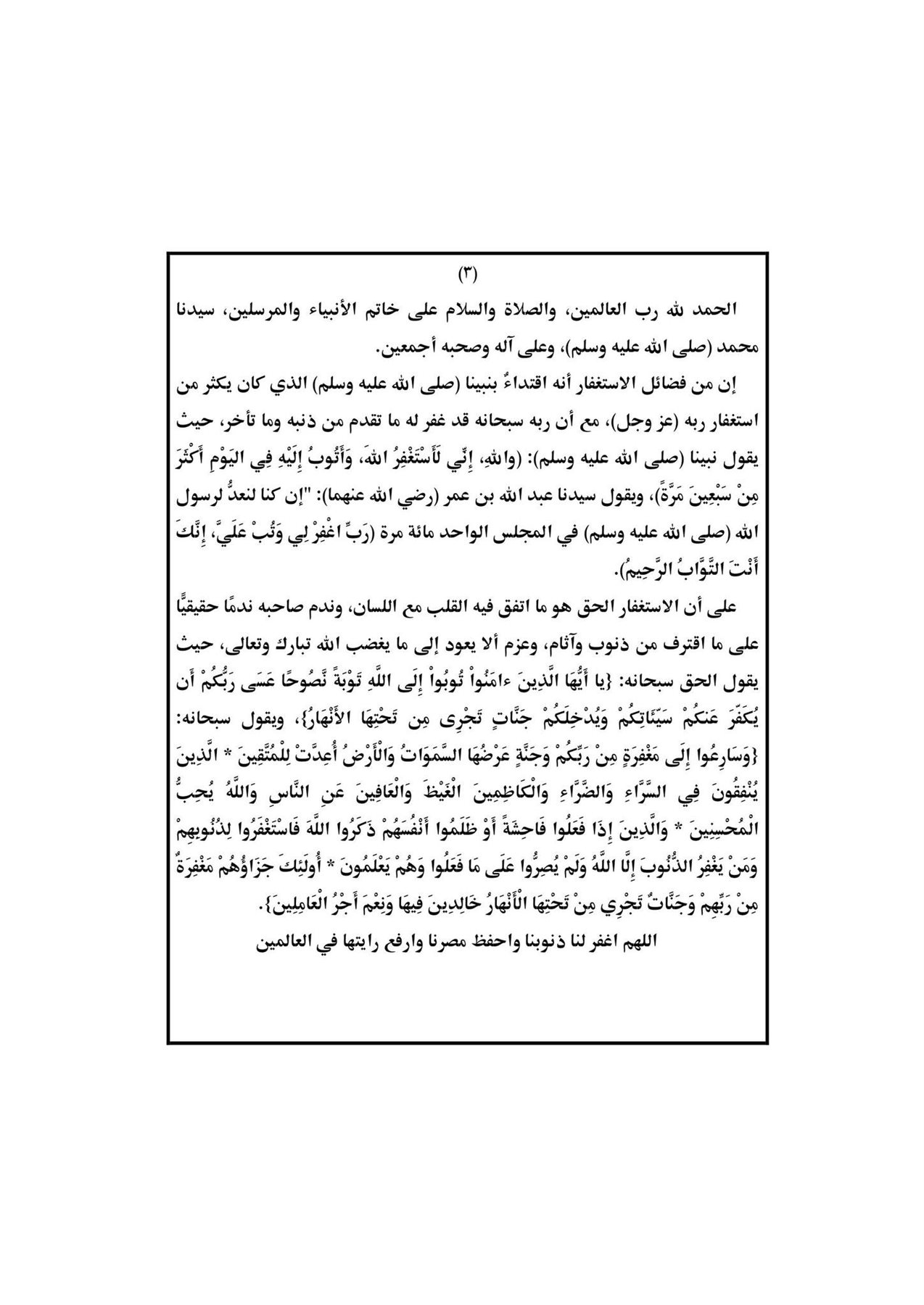 وواصلت: الحمد لله رب العالمين والصلاة والسلام على خاتم الأنبياء والمرسلين سيدنا محمد (صلی الله عليه وسلم وعلى آله وصحبه أجمعين. إن من فضائل الاستغفار أنه اقتداءً بنبينا صلى الله عليه وسلم الذي كان يكثر من استغفار ربه عز وجل مع أن ربه سبحانه قد غفر له ما تقدم من ذنبه وما تأخر، حيث يقول نبينا صلى الله عليه وسلم): (واللهِ إِنِّي لَأَسْتَغْفِرُ اللهَ وَأَتُوبُ إِلَيْهِ فِي اليَوْمِ أَكْثَرَ مِنْ سَبْعِينَ مَرَّةً)، ويقول سيدنا عبد الله بن عمر (رضي الله عنهما: "إن كنا لنعد الرسول - الله (صلى الله عليه وسلم في المجلس الواحد مائة مرة (رَبِّ ) ر لِي وَتُبْ عَلَيَّ، إِنَّكَ أَنْتَ التَّوَّابُ الرَّحِيمُ).