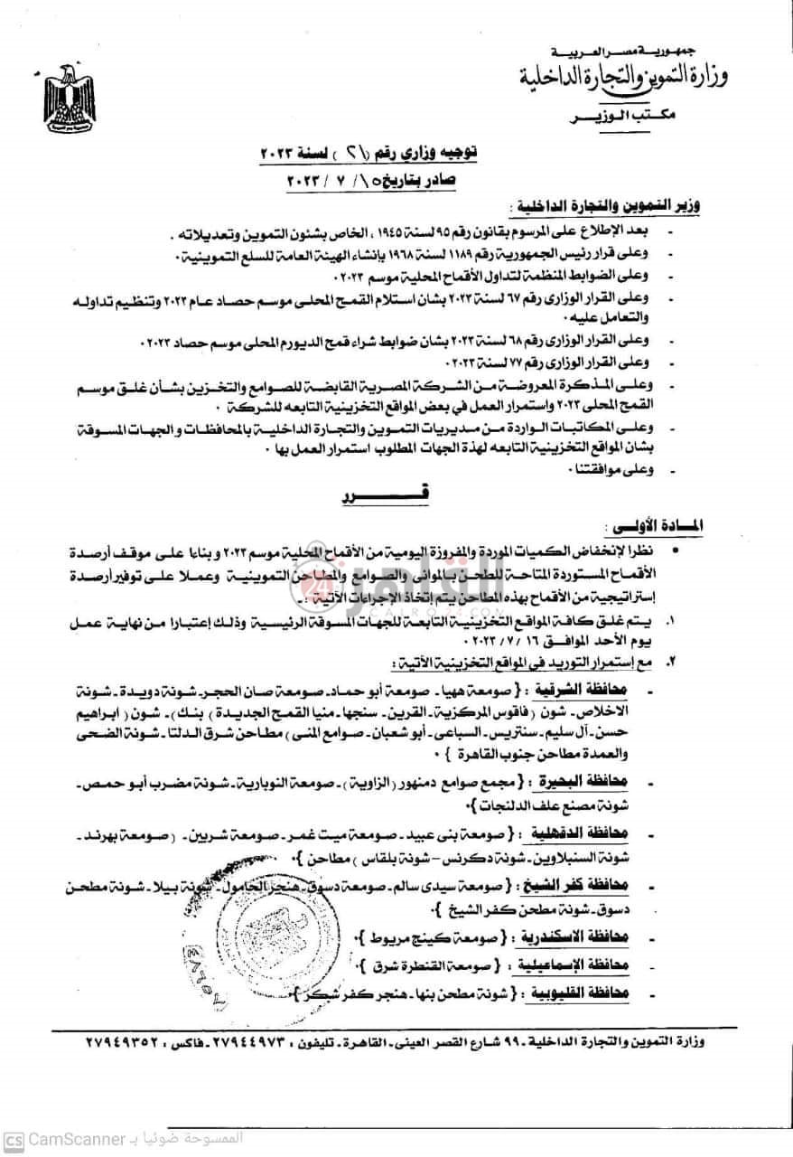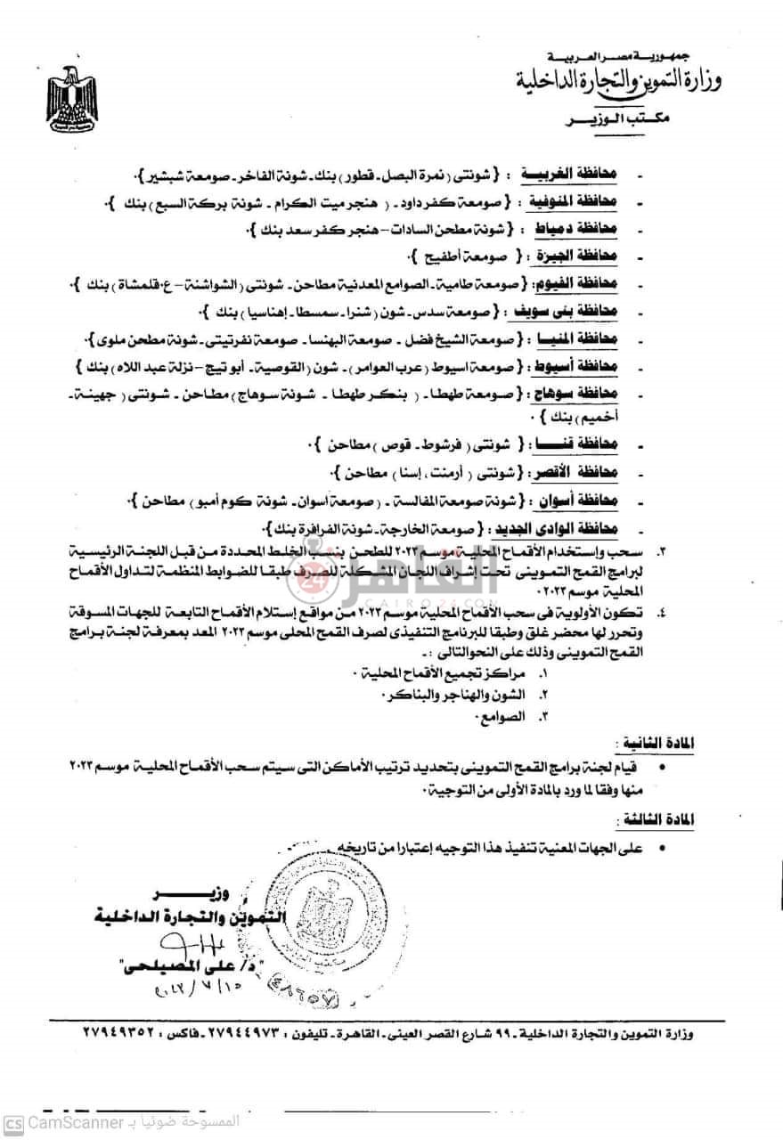 وأضاف قرار وزير التموين والتجارة الداخلية، أن يستمر التوريد في بعض مواقع التخزينية الآتية: