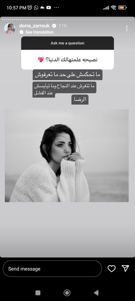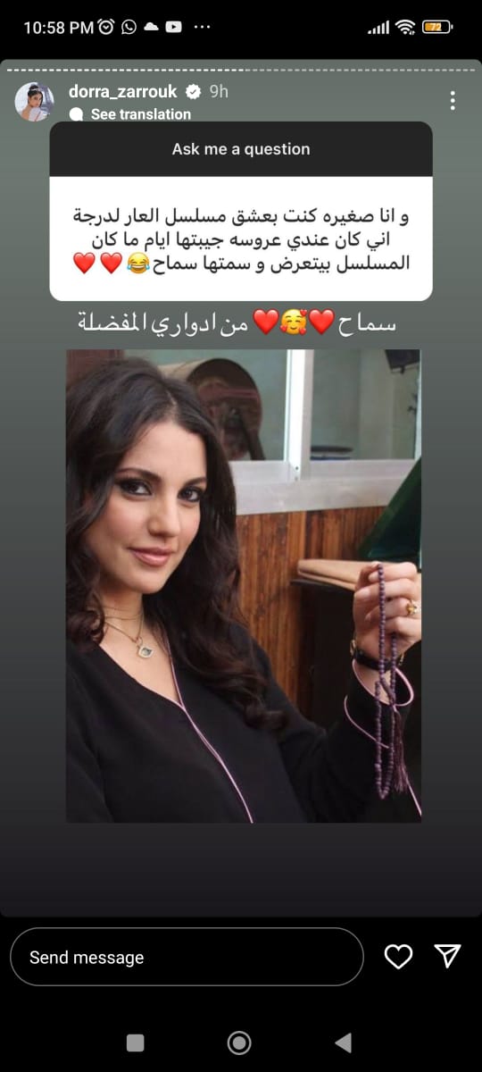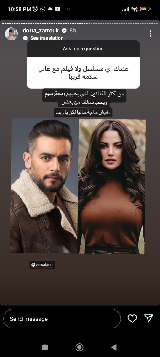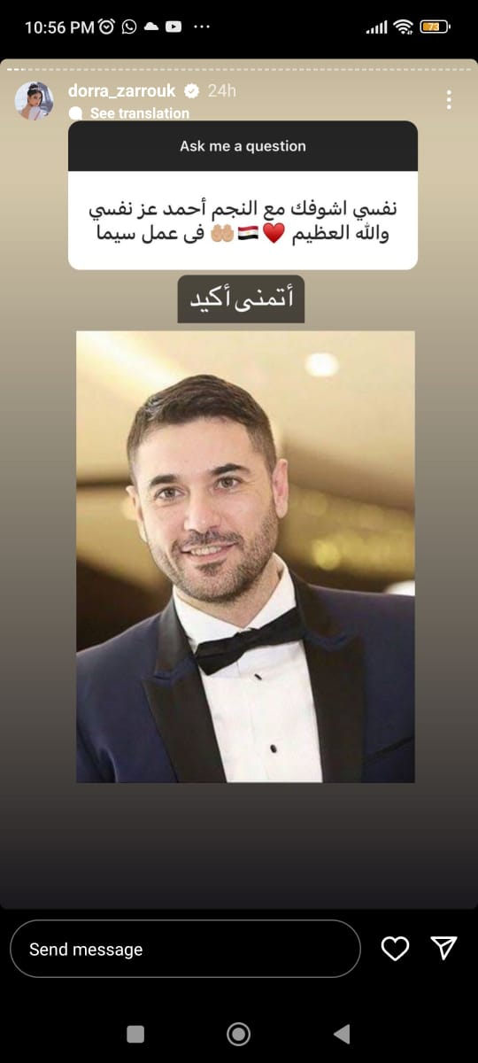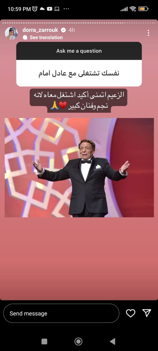 وردت درة على أسئلة متابعيها عبر حسابها الرسمي بـ إنستجرام، وذلك عبر خاصية ستوري، وجاء سؤال من أحد متابعيها، وهو هل تريد العمل مع الفنان عادل إمام، ردت قائلة: الزعيم أتمنى أكيد أشتغل معاه لأنه نجم وفنان كبير.