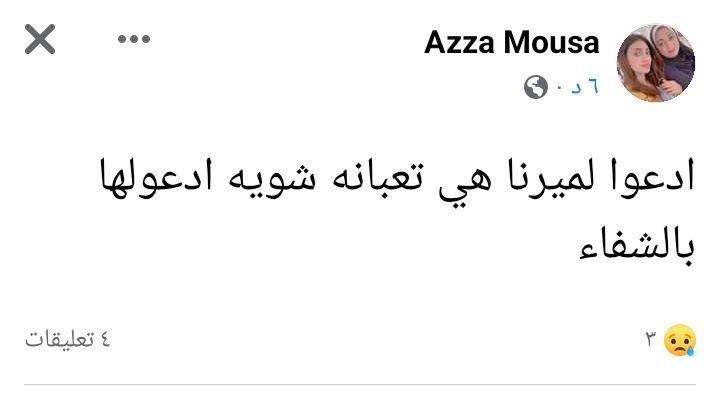 وكتبت والدة ميرنا هشام عبر حسابها الشخصي بموقع التواصل الاجتماعي، فيس بوك: ادعوا لميرنا هي تعبانة شوية ادعوا لها بالشفاء.