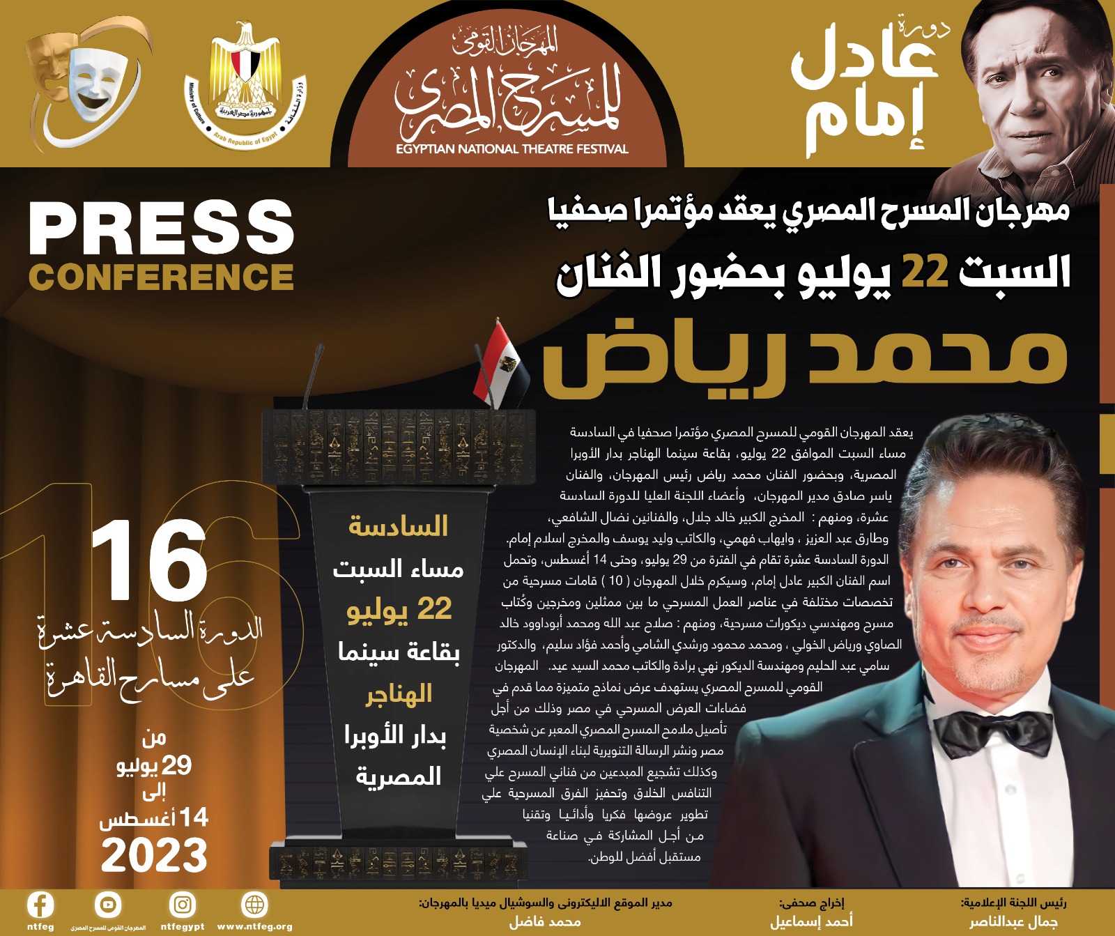 يعقد المهرجان القومي للمسرح المصري مؤتمرًا صحفيًا في السادسة مساء السبت الموافق 22 يوليو 2023، في قاعة سينما الهناجر بدار الأوبرا المصرية، وبحضور الفنان محمد رياض رئيس المهرجان، والفنان ياسر صادق مدير المهرجان، وأعضاء اللجنة العليا للدورة السادسة عشرة، ومنهم المخرج الكبير خالد جلال، والفنانين نضال الشافعي، وطارق عبد العزيز، وإيهاب فهمي، والكاتب وليد يوسف والمخرج إسلام إمام.