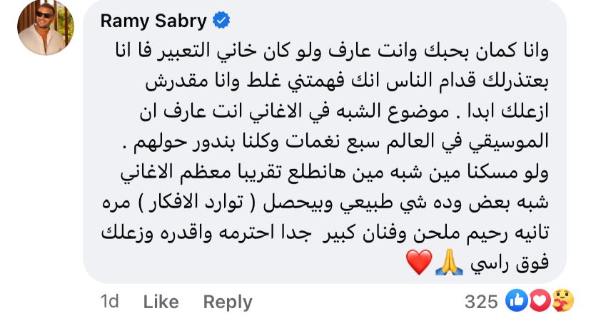 وكتب رامي صبري تعليقًا، على منشور محمد رحيم، عبر حسابه بموقع التواصل الاجتماعي فيس بوك، الذي كان يتهمه فيه بسرقة ألحانه، وجاء فيه: وأنا كمان بحبك وأنت عارف، ولو كان خاني التعبير فـ أنا بعتذر لك قدام الناس إنك فهمتني غلط، وأنا مقدرش أزعلك أبدا.