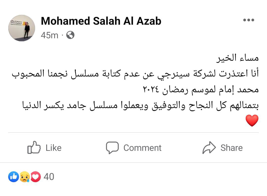 وكتب محمد صلاح العزب على حسابه الرسمي بـ فيس بوك منشورًا، معلقًا: مساء الخير.. أنا اعتذرت لشركة سينرجي عن عدم كتابة مسلسل نجمنا المحبوب محمد إمام لموسم رمضان 2024، وبتمنالهم كل النجاح والتوفيق ويعملوا مسلسل جامد يكسر الدنيا.