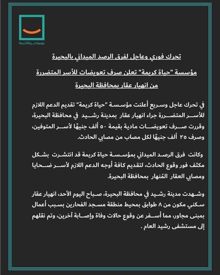 وكانت فرق الرصد الميداني بمؤسسة حياة كريمة قد انتشرت بشكل مكثف فور وقوع الحادث، لتقديم كافة أوجه الدعم اللازم لأسر ضحايا ومصابي العقار المنهار بمحافظة البحيرة.