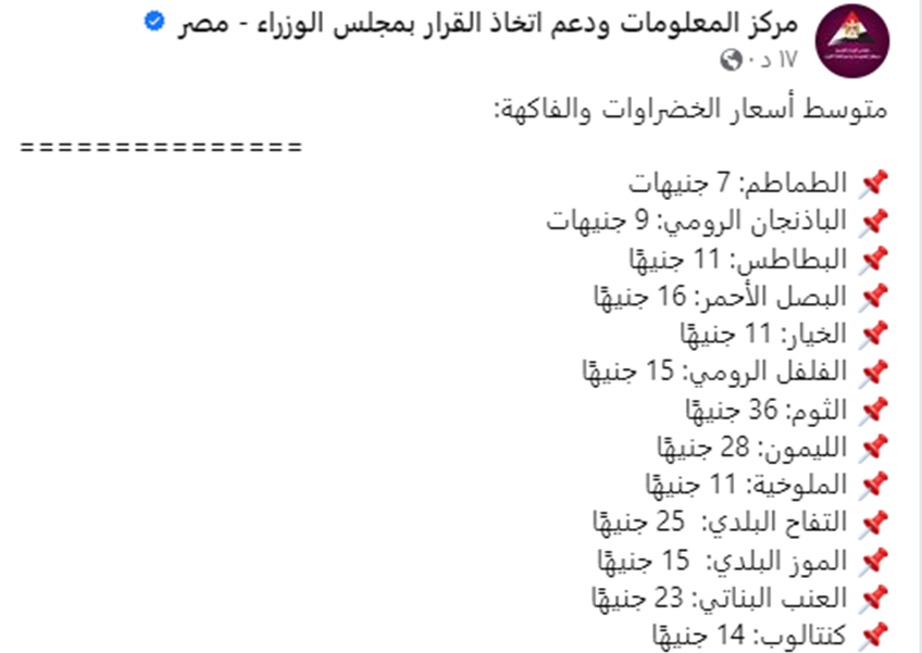 واستعرض منشور لـ معلومات الوزراء على صفحته الرسمية على فيسبوك، أسعار الخضراوات والفاكهة وجاءت كالتالي: