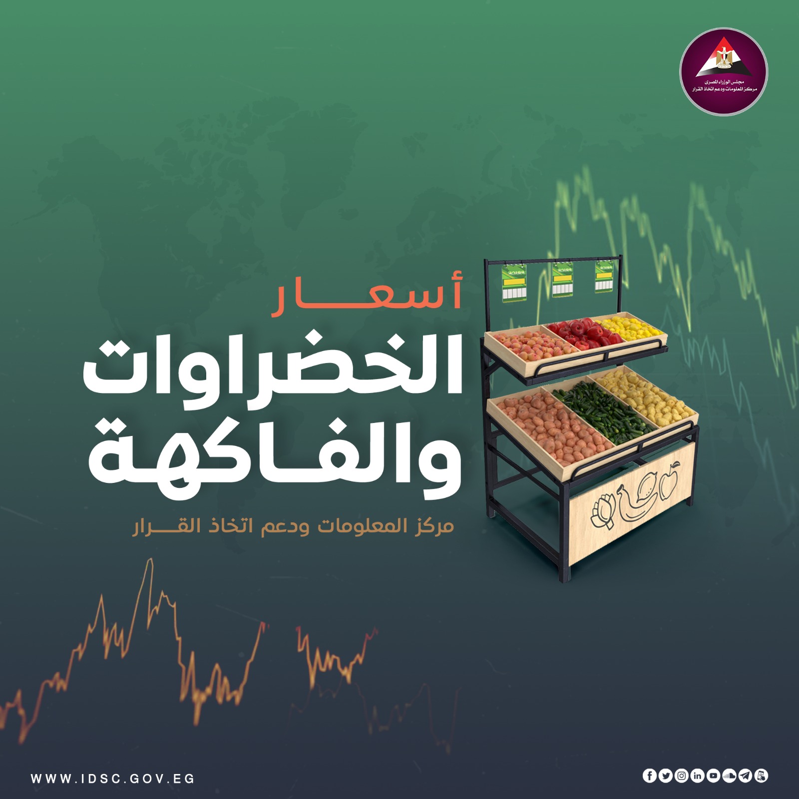 نشر مركز المعلومات ودعم اتخاذ القرار التابع لمجلس الوزراء، إنفوجراف سلط خلاله الضوء على متوسط أسعار الخضراوات والفاكهة، صباح اليوم الاثنين، تفاعلا مع أبرز الموضوعات التي تشغل المواطنين في الشارع المصري.