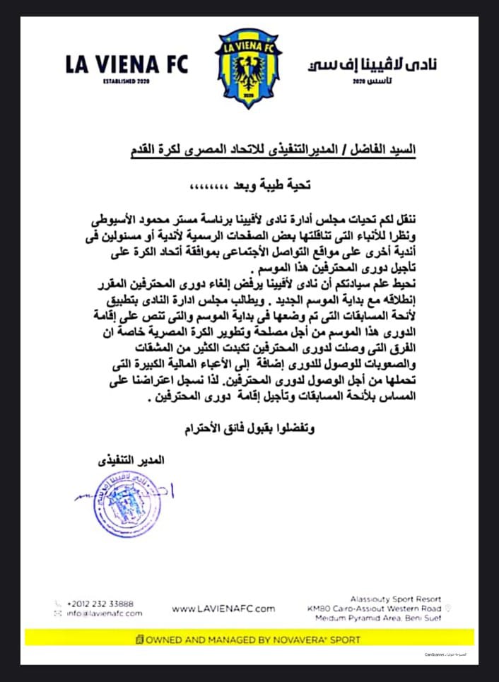 وأكد مجلس إدارة نادي لاڤيينا، في بيان، أن أي مساس بدوري المحترفين سيجبر النادي بالاتفاق مع الأندية المتضررة من الإلغاء على عدة قرارات ستكون عواقبها كبيرة على كرة القدم المصرية؛ أولها رفع دعوى قضائية ضد اتحاد الكرة مطالبين فيها بالتعويض المادى بما يتناسب مع حجم الإنفاق الكبير للأندية التي واجهت الكثير من التحديات حتى تصل لدوري المحترفين كذلك الضرر المادي والمعنوي الذي سيقع على الفرق التي وصلت للدوري أملا في تطوير الكرة المصرية بإقامة هذا الدوري القوى.