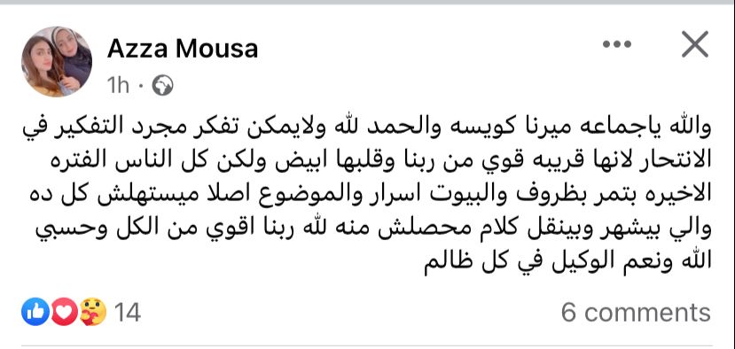 وعلقت والدتها عبر حسابها الشخصي بموقع التواصل الاجتماعي بفيسبوك: والله يا جماعة ميرنا كويسة والحمد لله ولا يمكن تفكر مجرد التفكير في الانتحار، لأنها قريبة قوي من ربنا وقلبها أبيض، ولكن كل الناس الفترة الأخيرة بتمر بظروف والبيوت أسرار والموضوع أصلا ميستهلش كل ده، واللي بيشهر وبينقل كلام محصلش منه لله ربنا أقوى من الكل وحسبي الله ونعم الوكيل في كل ظالم.