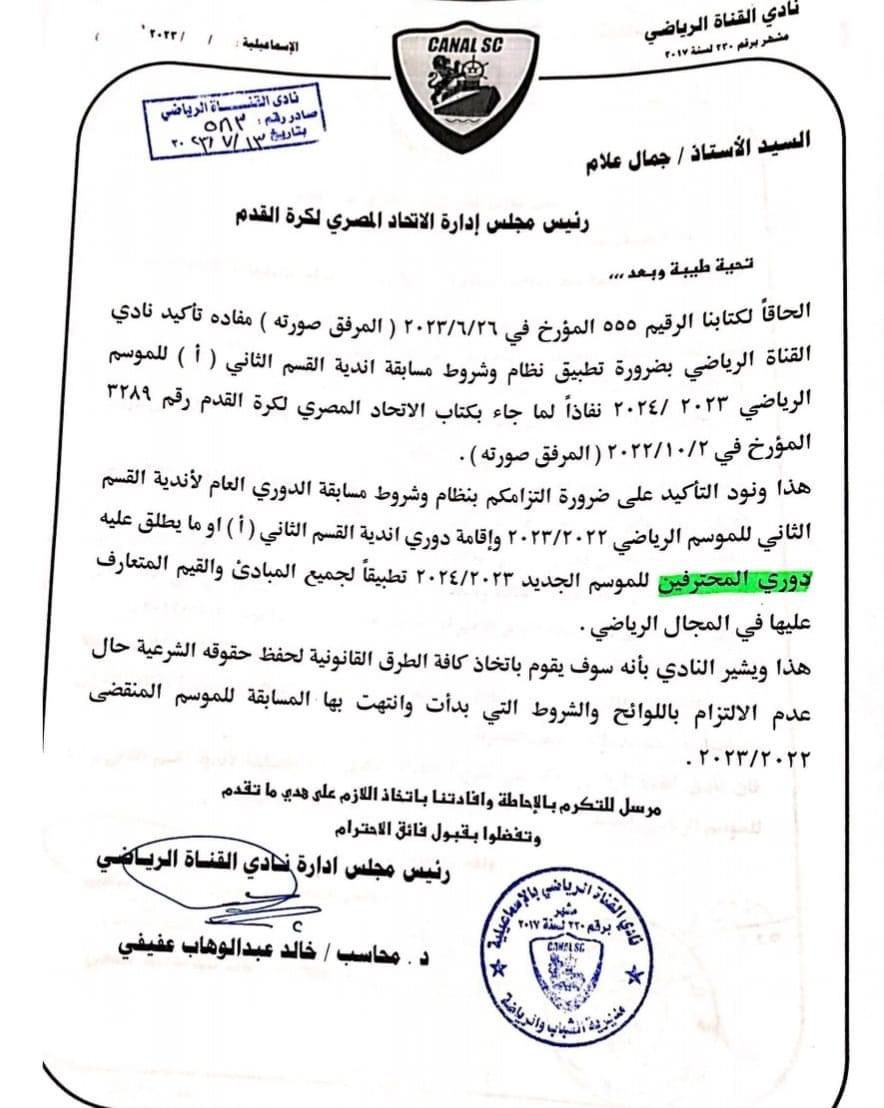 أرسل نادي القناة خطابا إلى الاتحاد المصري لكرة القدم، برئاسة خالد عبد الوهاب عفيفي بشأن تطبيق دوري المحترفين للموسم المقبل 2023-2024.