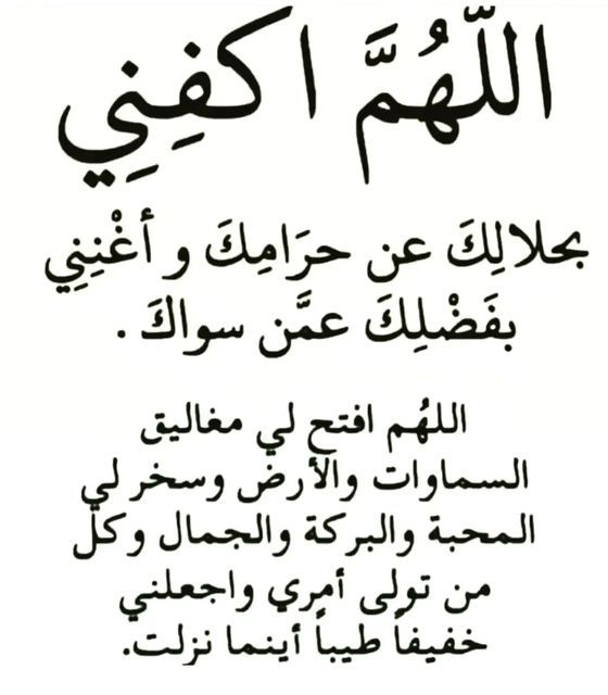 - اللَّهُمَّ مالِكَ الملْكِ تُؤتي الملكَ من تشاءُ وتنزِعُ الملكَ ممَّن تشاءُ وتُعِزُّ من تشاءُ وتُذِلُّ من تشاءُ بيدِك الخيرُ إنَّك على كلِّ شيءٍ قديرٌ رحمنَ الدُّنيا والآخرةِ ورحيمَهما تعطيهما من تشاءُ وتمنعُ منهما من تشاءُ ارحَمْني رحمةً تُغنيني بها عن رحمةِ من سواك" وهو من أفضل أدعية الحاجة قال عنه الرسول صلّى الله عليه وسلّم إذا دعي به الله استجاب، وهو من أقوى الأدعية لفك الكرب المادي وقضاء الديون، قال عنه الرسول صلّى الله عليه وسلّم لو كان على من يقوله ديون مثل الجبل قضاها الله عنه وأعانه عليها.