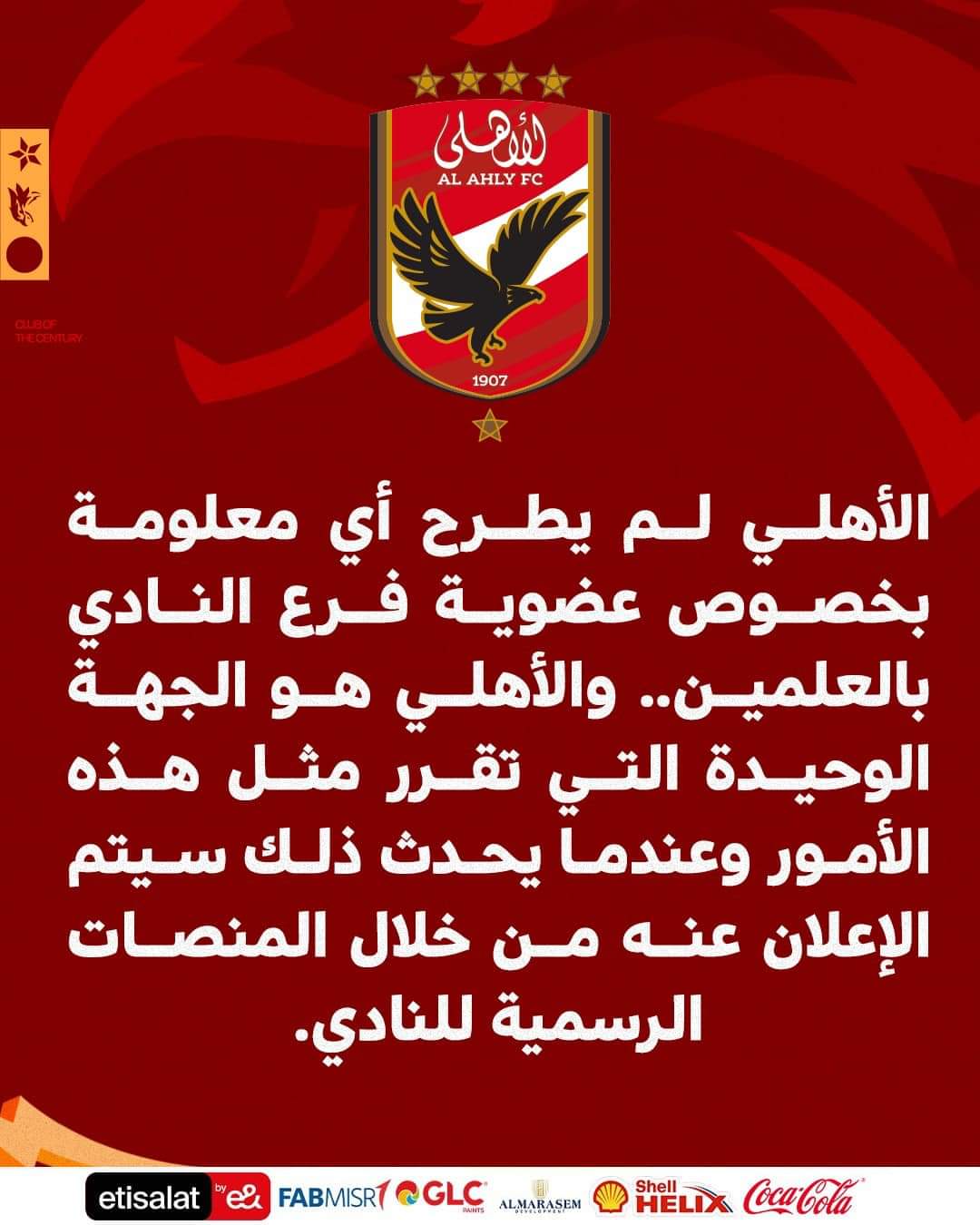 ونشر الأهلي عبر صفحته الرسمية: “الأهلي لم يطرح أي معلومة بخصوص عضوية فرع النادي بالعلمين والأهلي هو الجهة الوحيدة التي تقرر مثل هذه الأمور، وعندما يحدث ذلك سيتم الإعلان عنه من خلال المنصات الرسمية للنادي”.