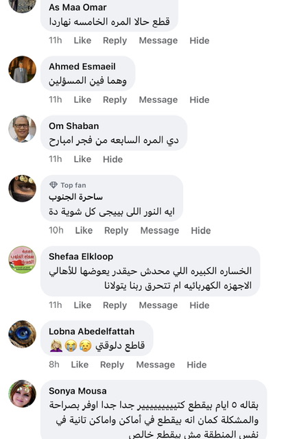 وقال رأفت رزيق لـ القاهرة 24: ياريت توصلوا صوتنا للمسؤولين عندنا ناس مريضة ضغط ومش بتتحرك من على الفراش حرام كده كل ساعتين النور بيقطع والجو حر موت في الأقصر.