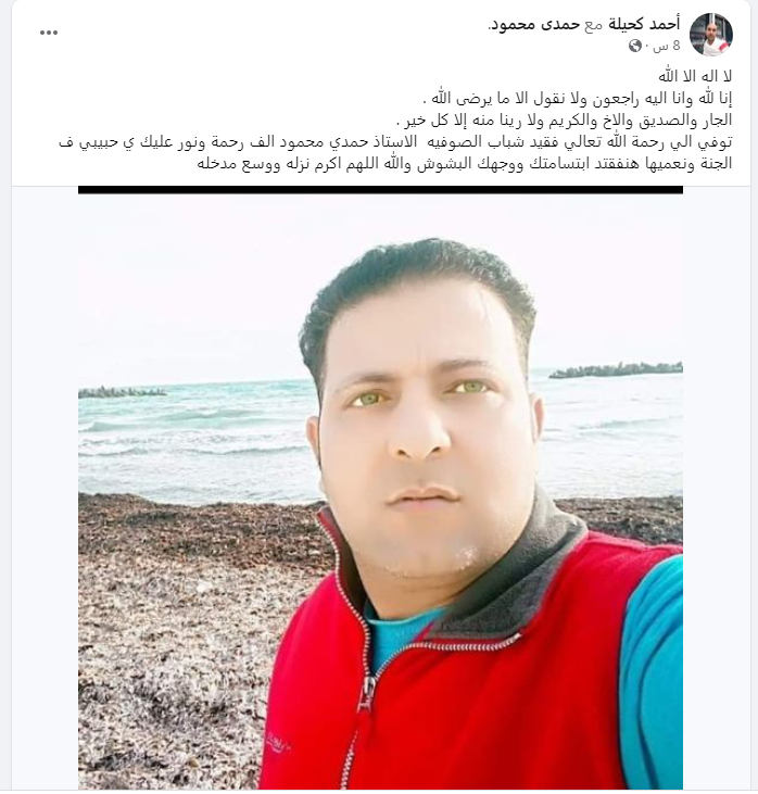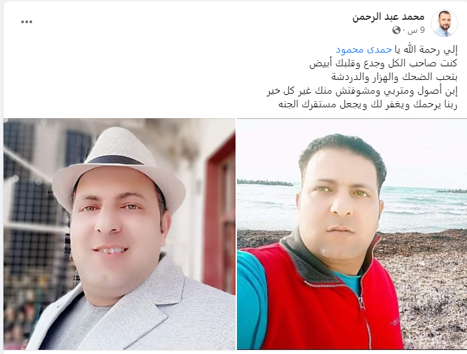 وتحولت صفحات مواقع الاجتماعي بقرية الصوفية إلى دفاتر عزاء للشاب الراحل، حيث كتب أحد جرانه عبر حسابه بفيسبوك: إلى رحمة الله يا حمدي.. كنت صاحب الكل وجدع وقلبك أبيض.. بتحب الضحك والهزار والدردشة.. ابن أصول ومتربي ومشوفتش منك غير كل خير.. ربنا يرحمك ويغفر لك ويجعل مستقرك الجنة.