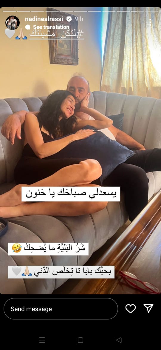 ونشرت نادين الراسي، مقطع فيديو عبر ستوري حسابها الشخصي بموقع تبادل الصور والفيديوهات إنستجرام، ظهرت خلاله تحتضن والديها واللذان كانا على وشك النوم، كما نشرت صورة أخرى برفقة والدها الذي ظهر يقبل رأسها، وعلقت قائلة: صباح الخير يا حنون.. شر البلية ما يضحك.. بحبك يا بابا حتى تخلص الدنيا.