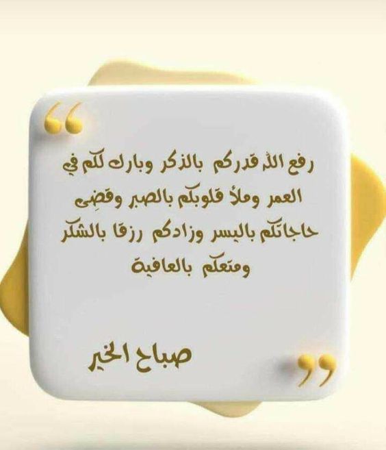 - أسأل الله مالك الملك أن يغمركم بنعيم الإيمان وعافية اﻷبدان، ويرزقكم صباح الشاكرين ومساء المستغفرين وقلوب الذاكرين، وجعل أيامكم جميلة "كأنفاس الطيبين نقية كأرواح الصالحين منيرة كوجوه المتقين، ومتعكم الله برضاه وزكاكم بتقواه ورفع ذكركم في أهل أرضه وسماه.. صباح الخير.