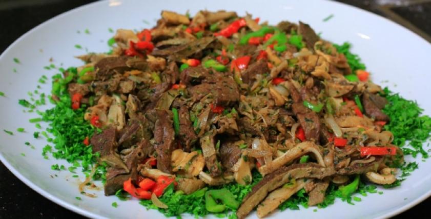 - تنظيف الطحال من القشرة الخارجية، ثم نقطع الفشة المسلوقة والطحال إلى شرائح.