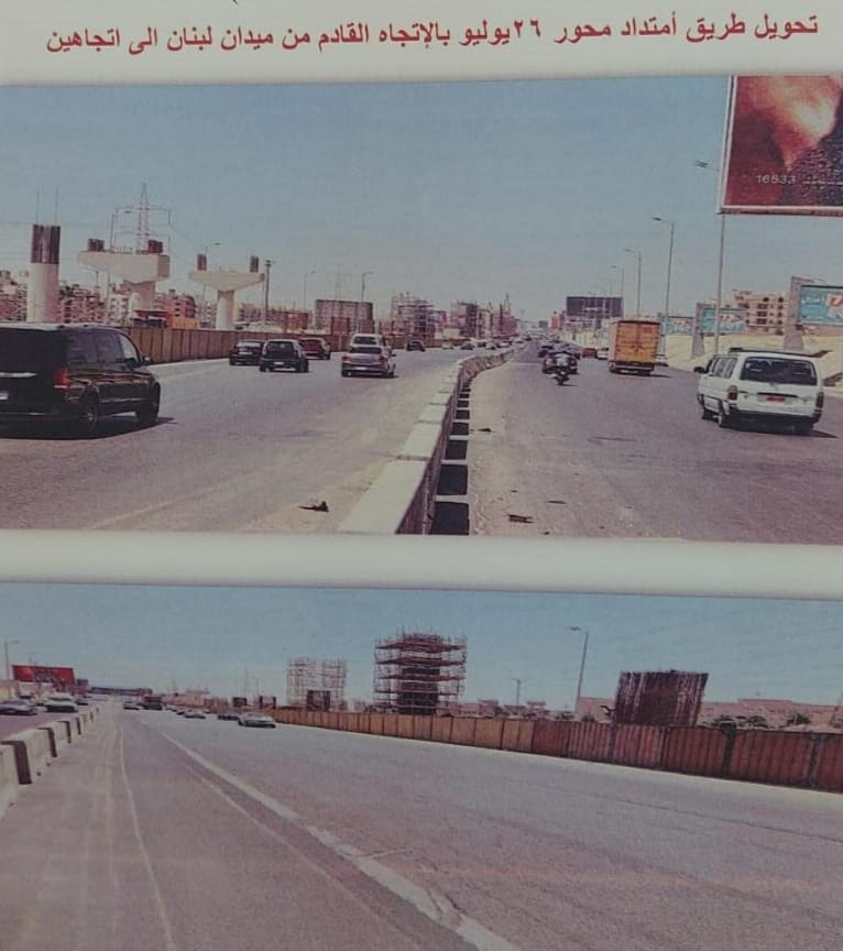 - حركة المركبات بطريق امتداد محور 26 يوليو بالاتجاه القادم من مسجد الشرطة وميدان جهينة وترغب بالسير اتجاه محور 26 يوليو وطريق مصر إسكندرية الصحراوي الدخول يسارًا إلى الاتجاه الأخر من الطريق بعد تحويله إلى اتجاهين كما هو مشار إليه عن طريق فتحة الدخول المستحدثة بين الأعمدة الخرسانية.
