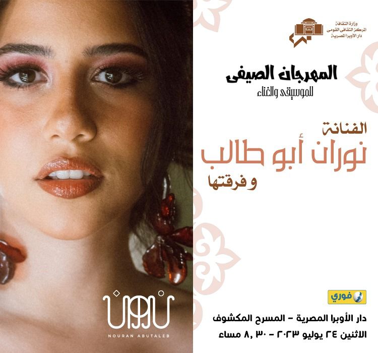 تقدم المطربة نوران أبو طالب حفلًا في الثامنة والنصف مساء الاثنين 24 يوليو على المسرح المكشوف، وذلك استمرارًا لفعاليات المهرجان الصيفي للموسيقى والغناء الذي تنظمه دار الأوبرا المصرية برئاسة الدكتور خالد داغر.