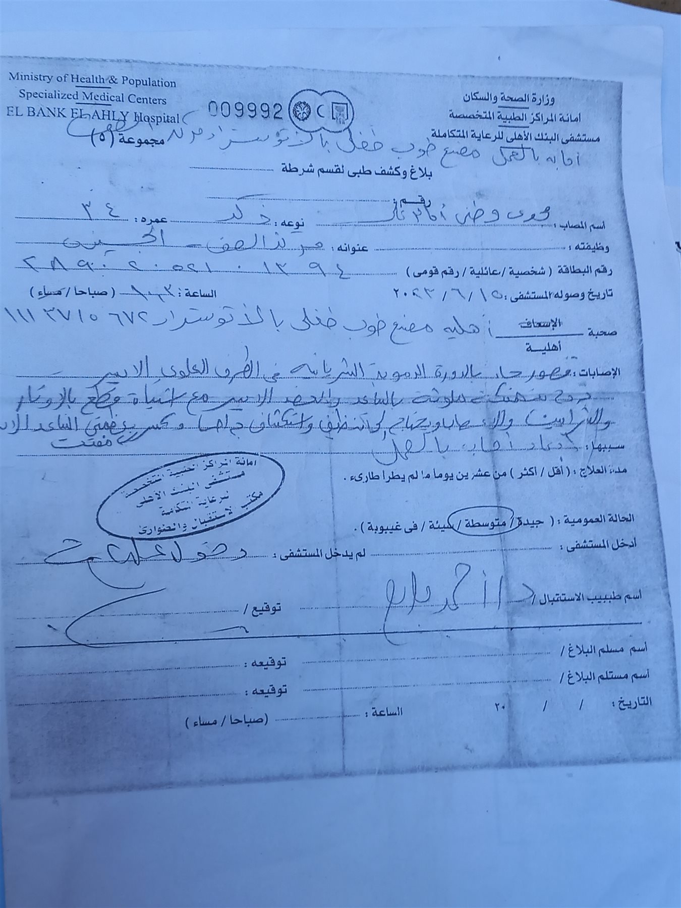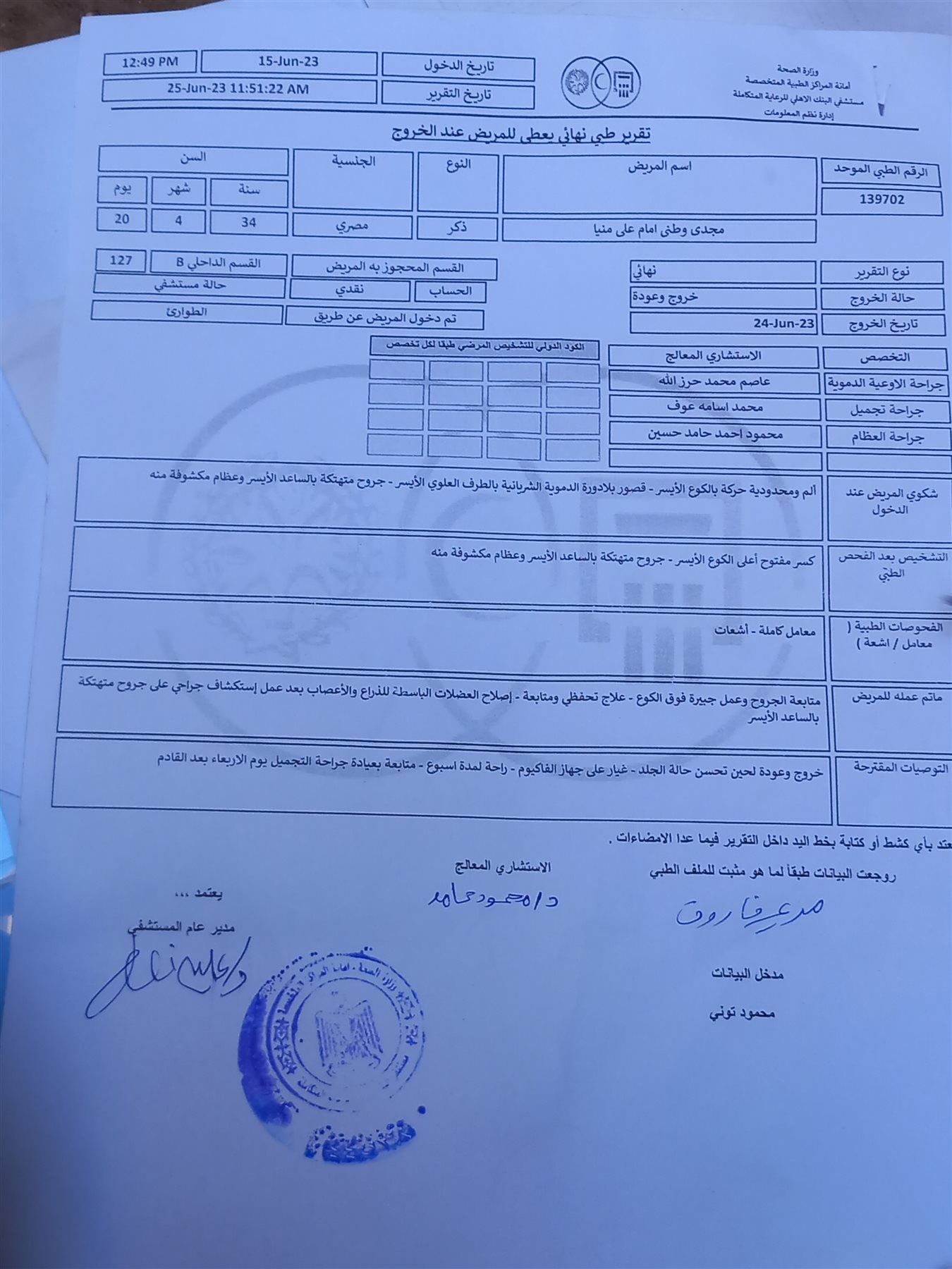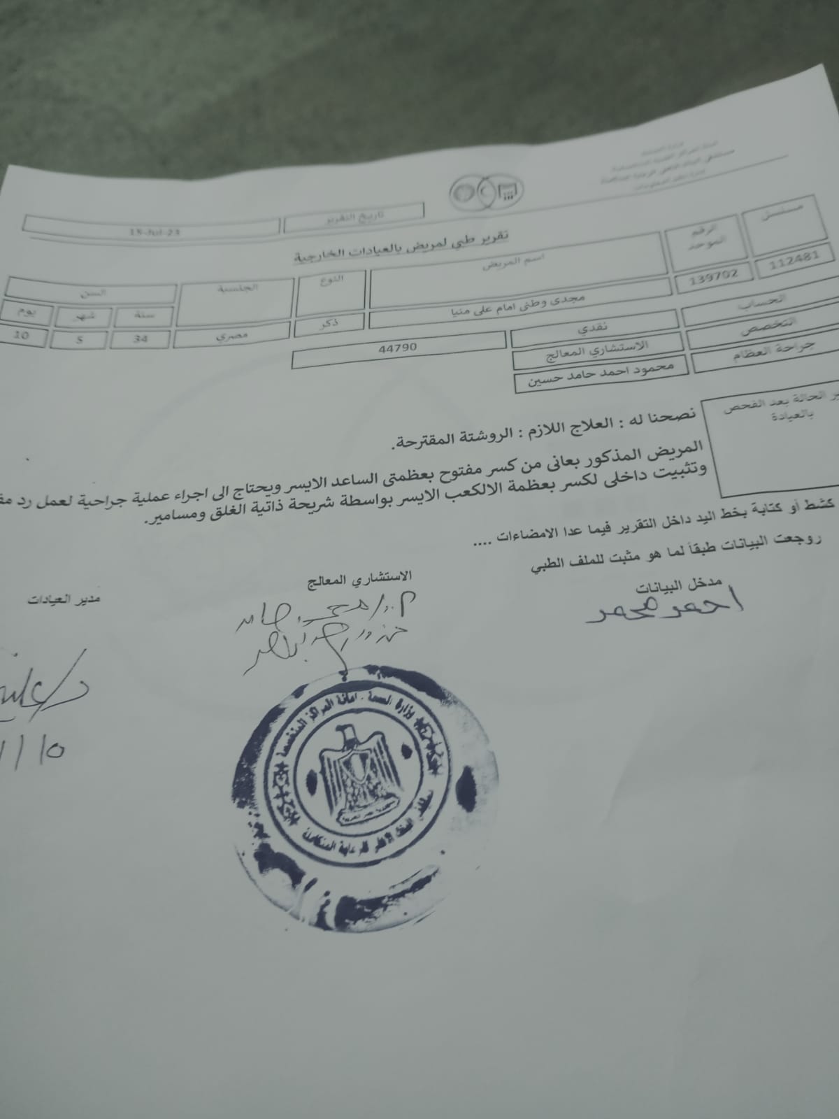 وجاء التقرير الطبي النهائي موضحًا أن التشخيص بعد الفحص الطبي تضمن كسر مفتوح أعلى الكوع الأيسر، جروح متهكتة بالساعد الأيسر وعظام مكشوفة منه، وأن ما تم عمله للمريض تمثل في متابعة الجروح وعمل جبيرة فوق الكوع، وعلاج تحفظي ومتابعة، إصلاح العضلات الباسطة للذراع والأعصاب بعد عمل استكشاف جراحي على جروح متهتكة بالساعد الأيسر.