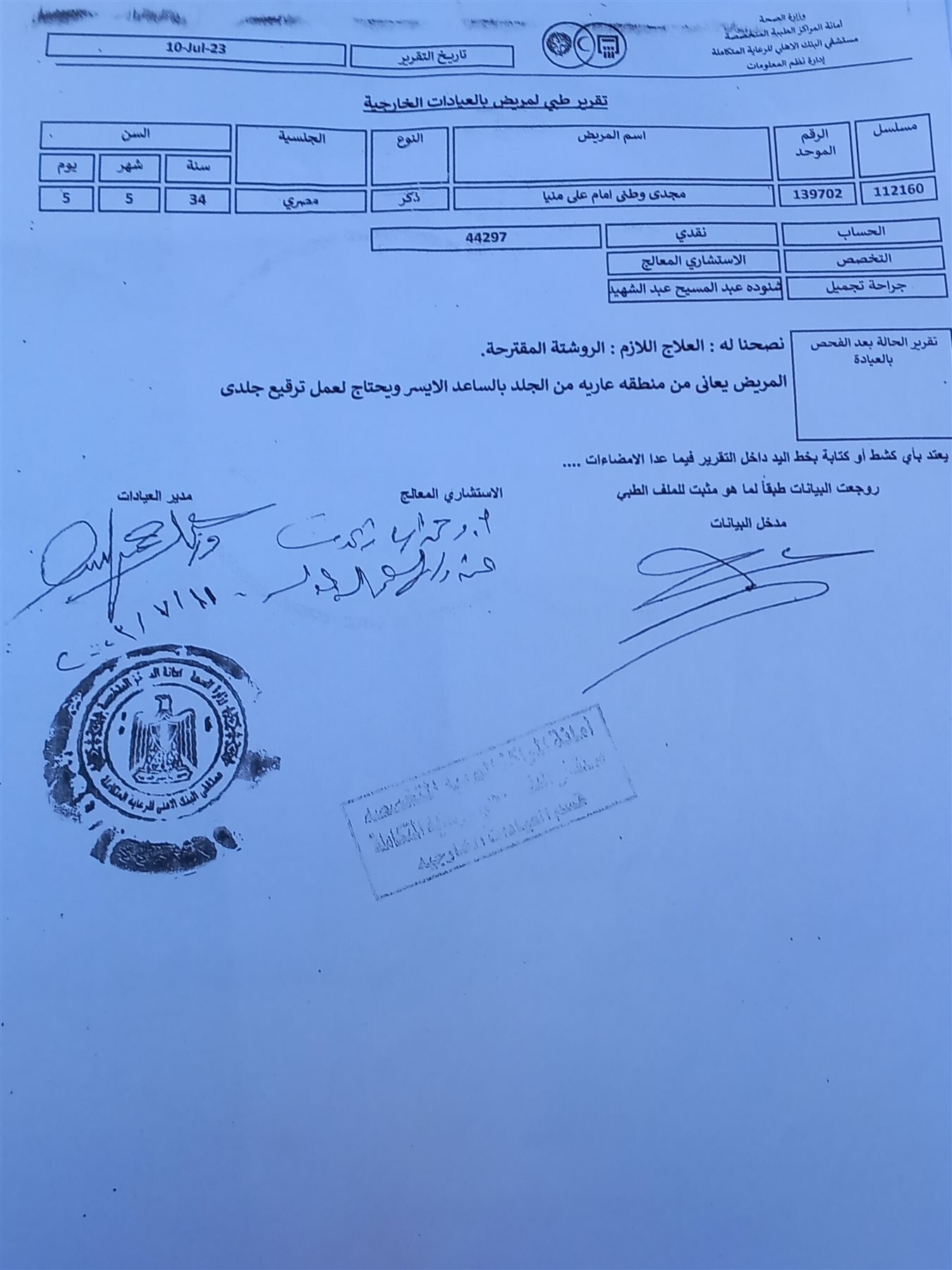 وتابع: حدث لي نزيف كبير، وذهبت مع عدد من المسئولين والعاملين بالمصنع لعدد من المستشفيات، وبعد 29 ساعة من البحث، تم دخولي عمليات بأحد المستشفيات حيث تم تشخيصي بقصور جاد بالدورة الشريانية في الطرف العلوي الأيسر، وجروح متهتكة بالساعد والعضم الأيسر، مع اشتباه قطع بالأوتار، والشرايين الأعصاب ويحتاج إلى تنظيف واستشكاف جراحي.