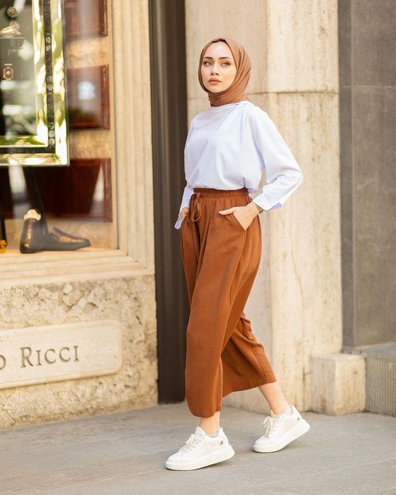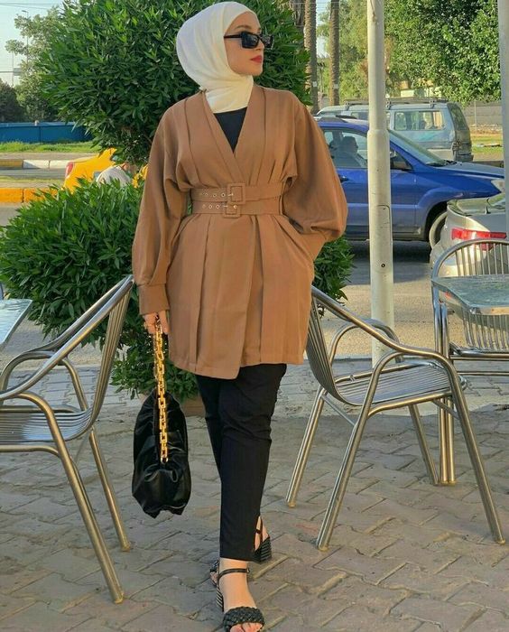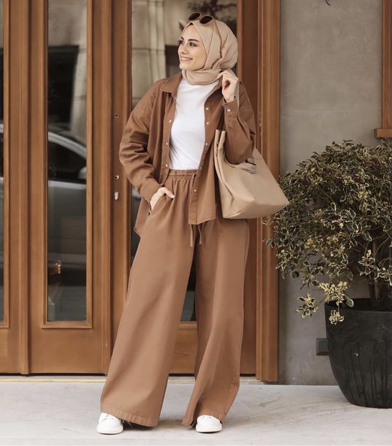 - درجات اللون البني تبدو اختيار رائع لطلة مميزة بشرط تدرج الألوان من الأعلى للأسفل بحيث تكون أفتح في الحجاب وتزيد قتامتها في البنطال أو الجيب.