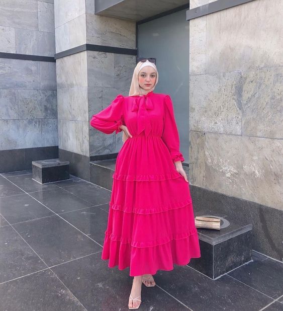 - إضفاء حدة الفستان الفوشيا السادة بحجاب بيج أو أوفوايت وشنطة وحذاء من درجة البيجات الهادئة.