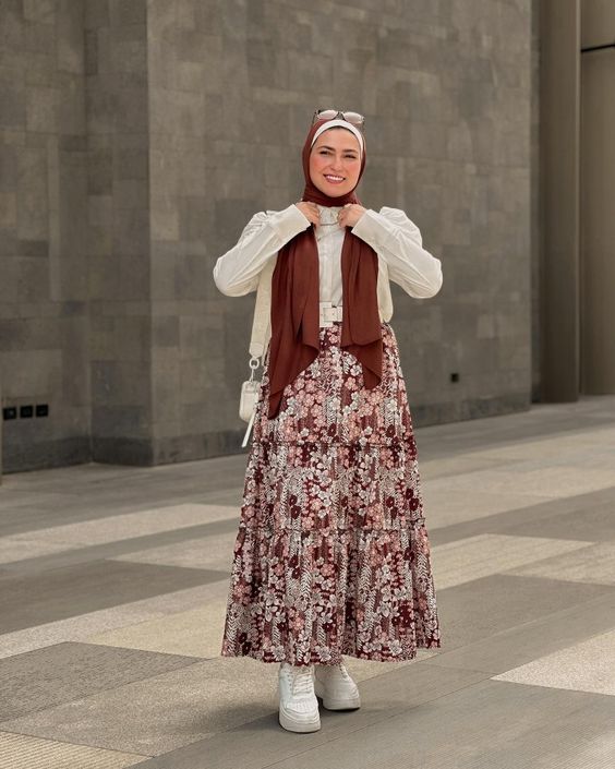 - الحجاب البني المزركش قطعة أساسية في دولابك تليق مع معظم طلاتك.
