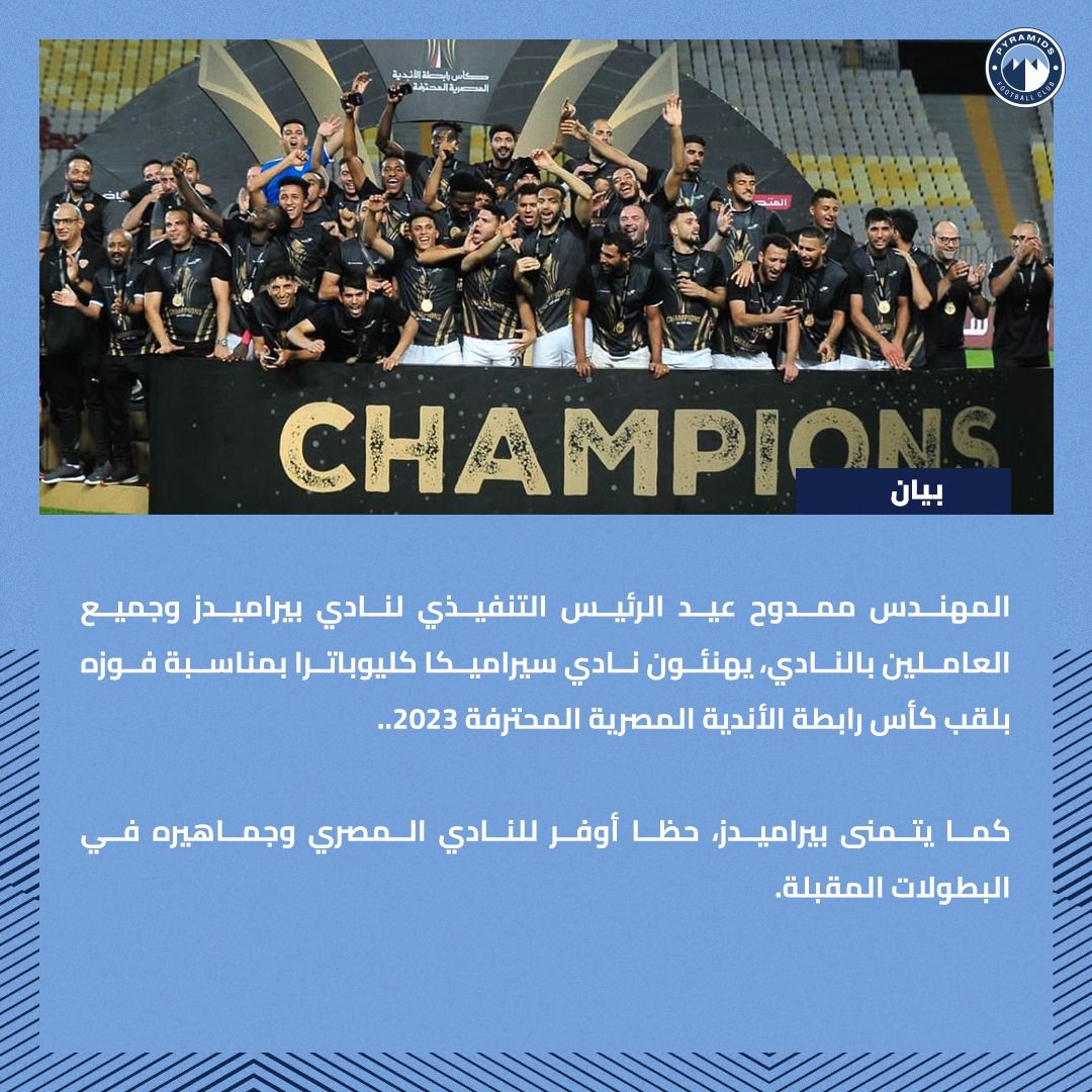 المهندس ممدوح عيد الرئيس التنفيذي لنادي بيراميدز وجميع العاملين بالنادي، يهنئون نادي سيراميكا كليوباترا بمناسبة فوزه بلقب كأس رابطة الأندية المصرية المحترفة 2023