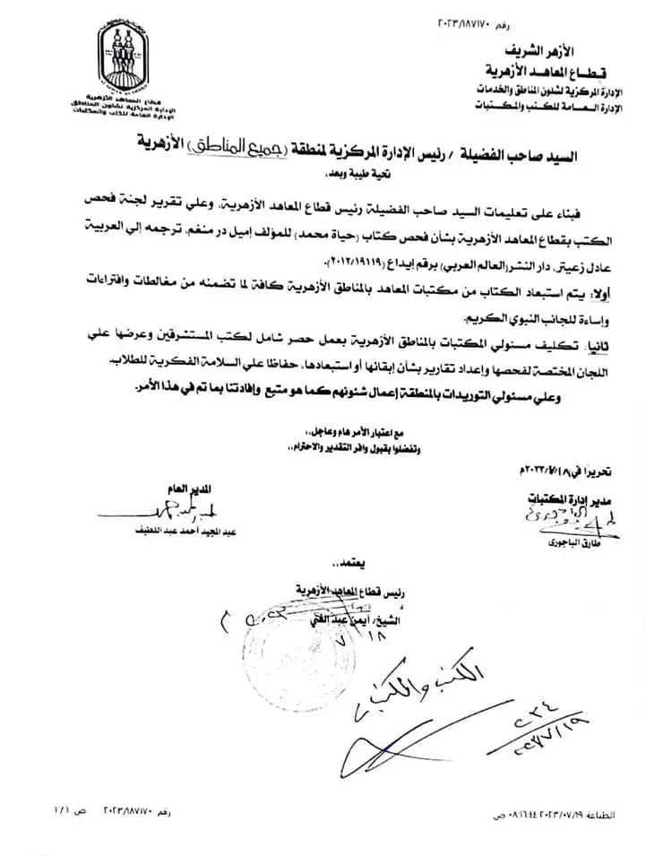 وجه الشيخ أيمن عبد الغني رئيس قطاع المعاهد الأزهرية، بناءً على تقرير لجنة فحص الكتب بقطاع المعاهد بشأن فحص كتاب (حياة محمد) للمؤلف إميل درمنغم - ترجمة إلى العربية عادل زعيتر دار النشر العالم العربي، برفع الكتاب من كافة مكتبات المعاهد الأزهرية.