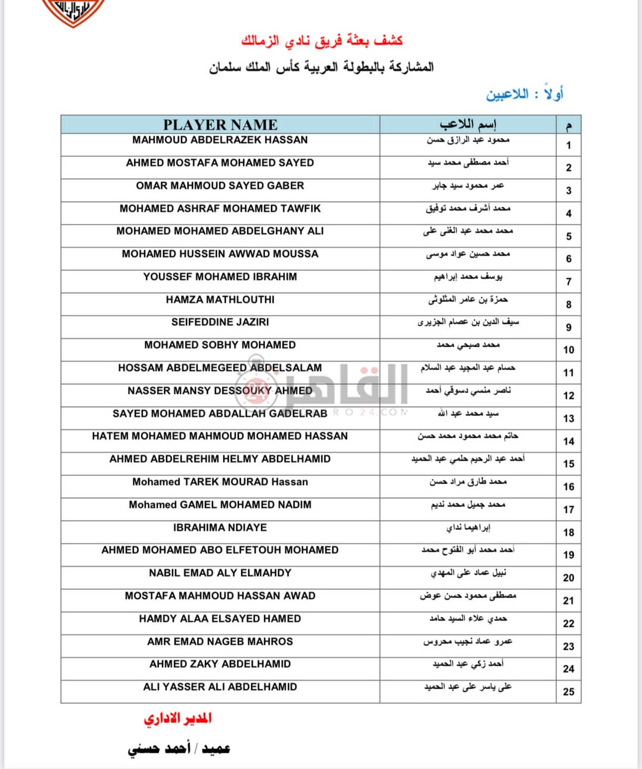 أعلن الجهاز الفني للفريق الأول لكرة القدم بنادي الزمالك بقيادة الكولومبي خوان كارلوس أوسوريو، قائمة الأبيض التي ستسافر إلى السعودية مساء اليوم الأحد للمشاركة في البطولة العربية.