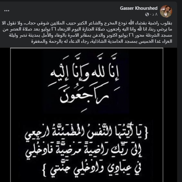 وأردف جاسر خورشيد حديثه كاشفًا موعد ومكان عزاء الشاعر الغنائي شوقي حجاب، إذ قال: ليلة العزاء غدا الخميس بمسجد الحامدية الشاذلية، رجاء الدعاء له بالرحمة والمغفرة.