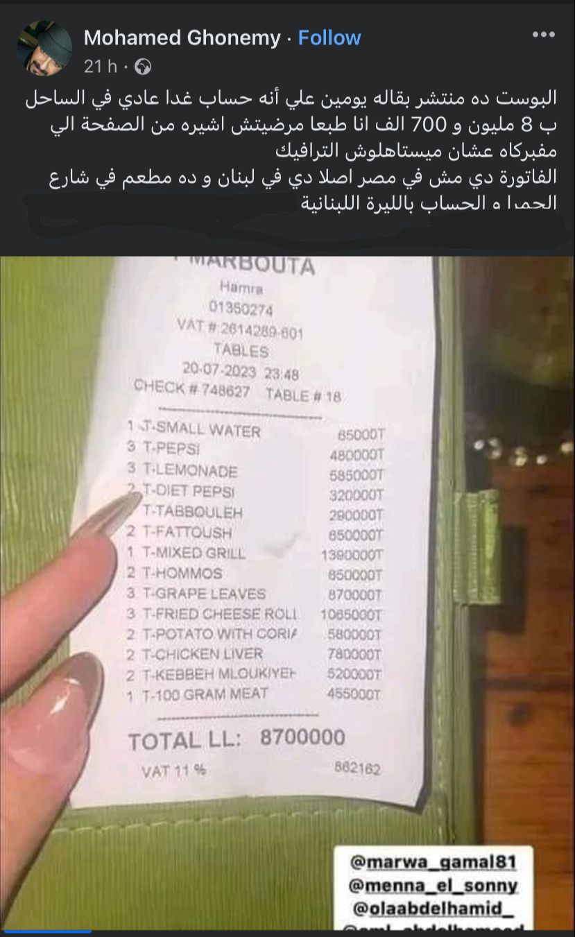 وكتب محمد غنيمي: البوست ده منتشر بقاله يومين على إنه حساب غدا عادي في الساحل بـ 8 مليون و700 ألف، أنا طبعا مرضيتش أشيره من الصفحة اللي مفبركاه عشان ميستاهلوش الترافيك، الفاتورة دي مش في مصر أصلًا دي في لبنان وده مطعم في شارع الحمرا والحساب بالليرة اللبنانية.
