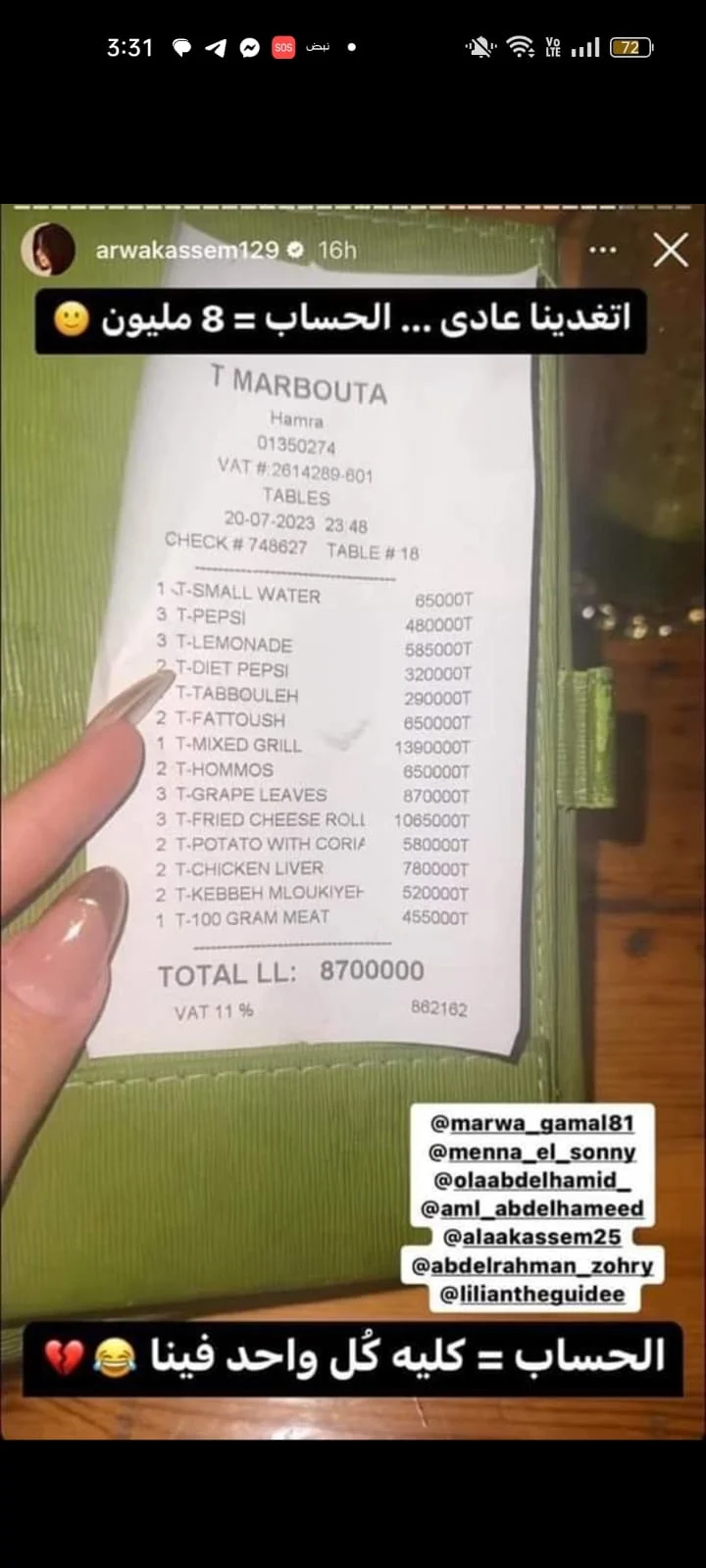 ونشرت البلوجر أروى قاسم صورة فاتورة حساب تناول وجبة غداء بأخد المطاعم في لبنان بقيمة 8 ملايين و700 ألف ليرة لبنانية، أي ما يعادل نحو 3 آلاف جنيه مصري، حيث علقت على هذه الصورة قائلة: اتغدينا عادي.. الحساب 8 مليون.