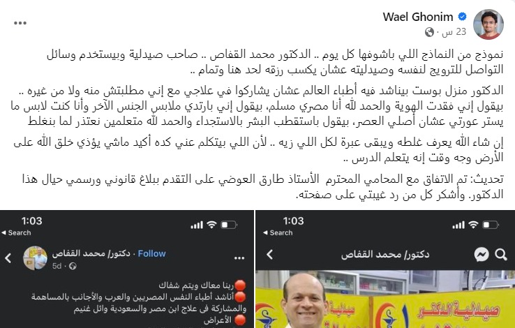 وكتب غنيم في منشور على صفحته بفيس بوك، قائلا: الدكتور محمد القفاص منزل بوست بيناشد فيه أطباء العالم عشان يشاركوا في علاجي مع إني مطلبتش منه ولا من غيره.. بيقول إني فقدت الهوية والحمد لله أنا مصري مسلم، بيقول إني بارتدي ملابس الجنس الآخر وأنا كنت لابس ما يستر عورتي عشان أصلي العصر، بيقول باستقطب البشر بالاستجداء والحمد لله متعلمين نعتذر لما بنغلط.
