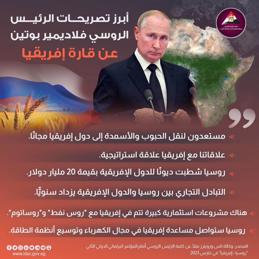 نشر مركز المعلومات ودعم اتخاذ القرار بمجلس الوزراء، إنفوجراف، سلط خلاله الضوء على أبرز تصريحات الرئيس الروسي فلاديمير بوتين عن قارة إفريقيا أمام المؤتمر البرلماني الدولي الثاني روسيا - إفريقيا في مارس 2023.