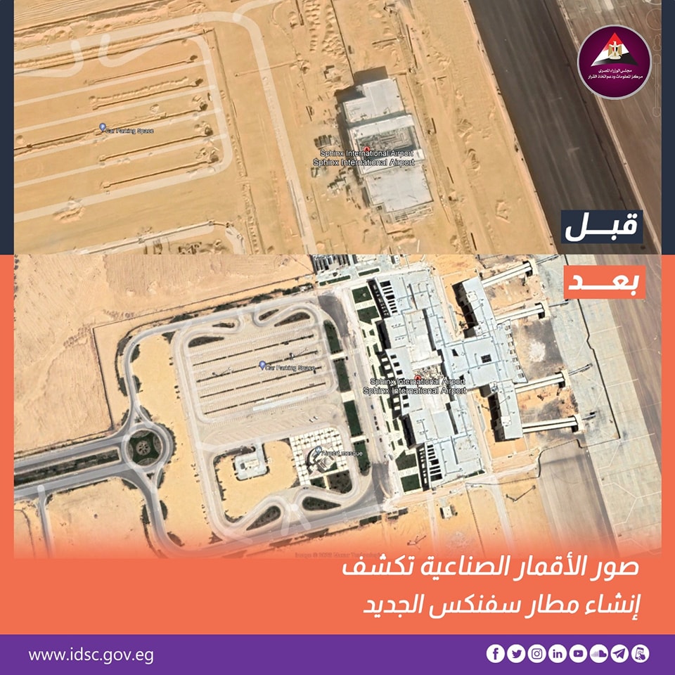 بصور الأقمار الصناعية.. مركز معلومات مجلس الوزراء يسلط الضوء على إنشاء مطار سفنكس الجديد