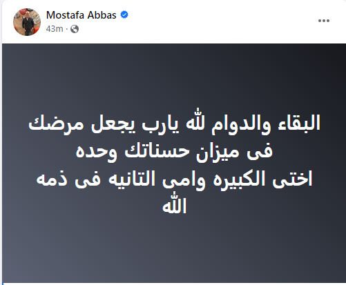 كتب مصطفى عباس منشورًا عبر حسابه الشخصي بموقع فيسبوك، جاء فيه: البقاء والدوام لله، يارب يجعل مرضك في ميزان حسناتك، أختي الكبيرة وأمي الثانية في ذمة الله.