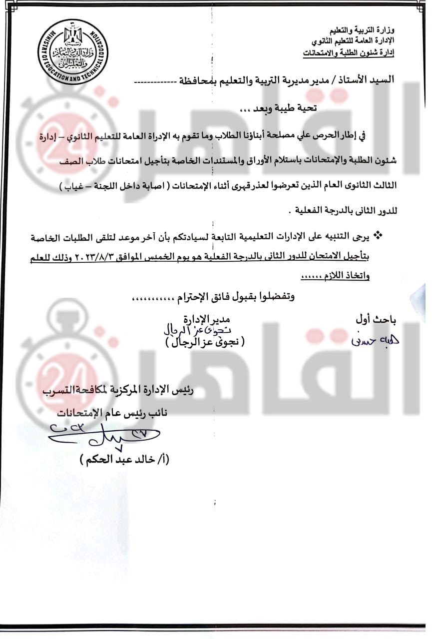توجيه عاجل من التعليم بشأن امتحانات الدور الثاني في الثانوية العامة 2023 | مستند