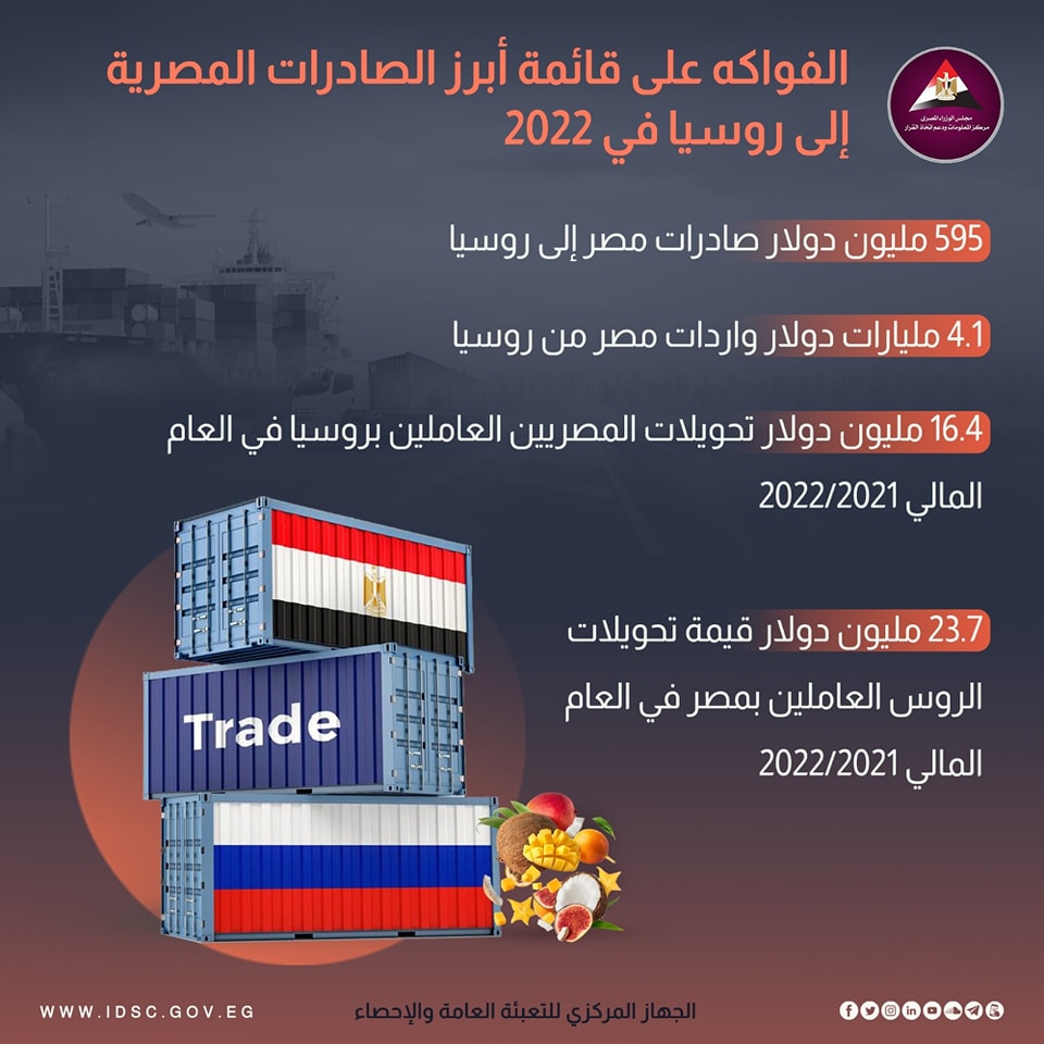 نشر مركز المعلومات ودعم اتخاذ القرار بمجلس الوزراء، انفوجراف، سلط خلاله الضوء على أبرز الصادرات المصرية إلى روسيا، حيث جاءت الفاكهة على رأس القائمة.
