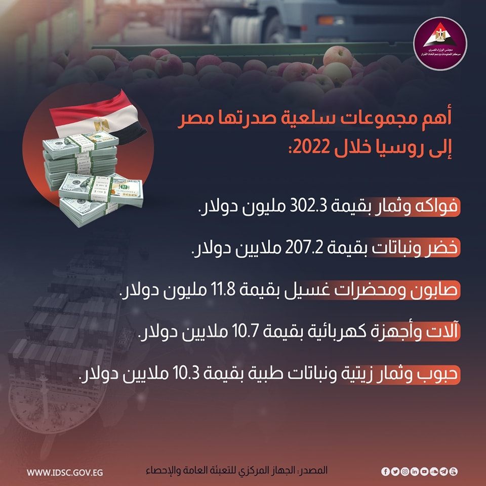 يواصل مركز المعلومات ودعم اتخاذ القرار بـ مجلس الوزراء نشر إنفوجرافات، يستعرض خلالها حجم الصادرات والواردات بين مصر وروسيا خلال عام 2022